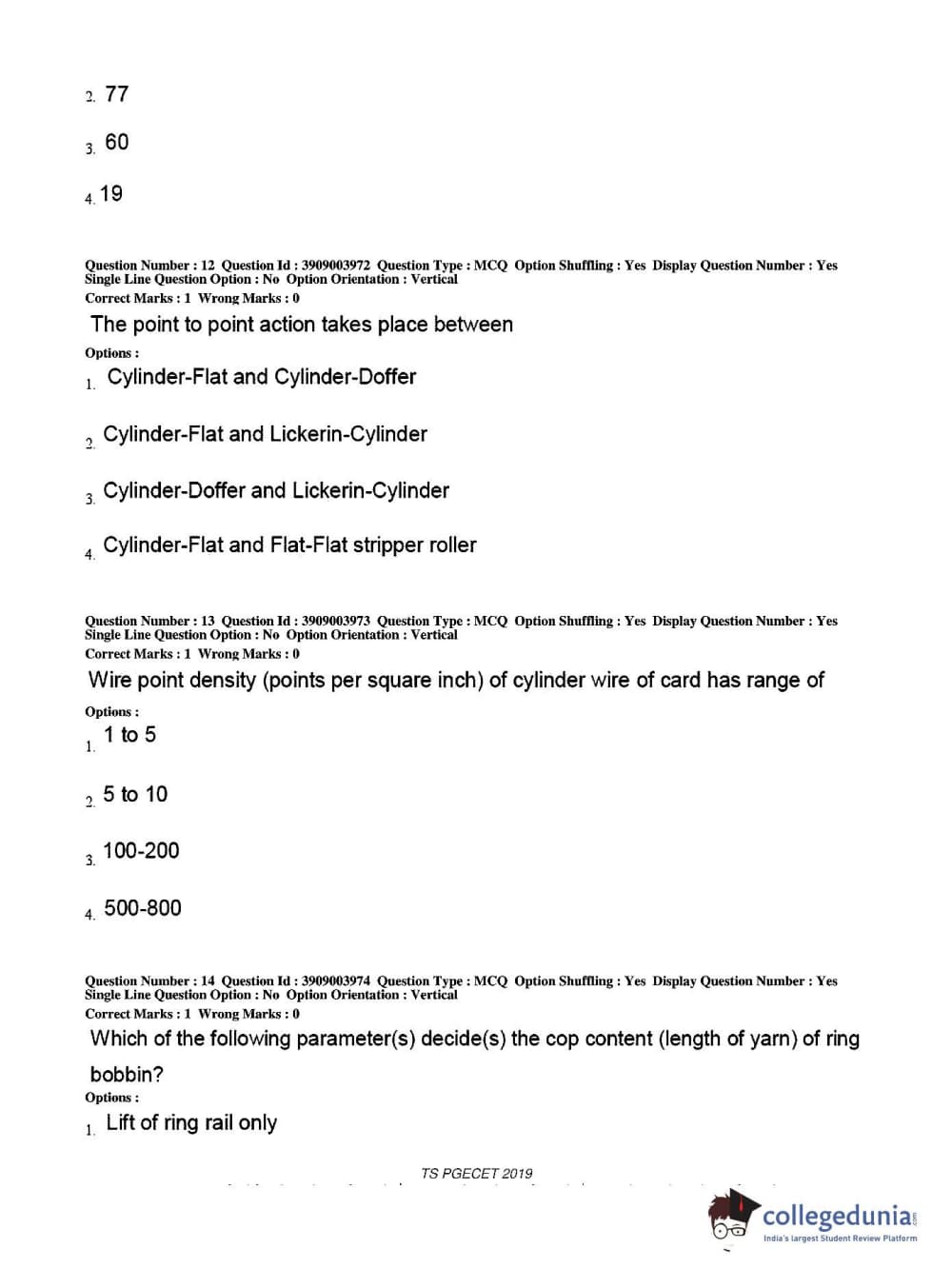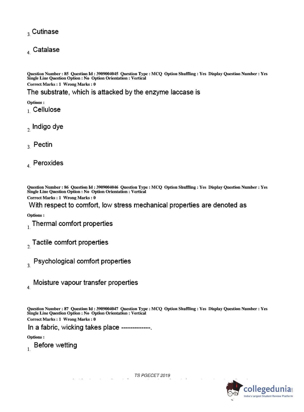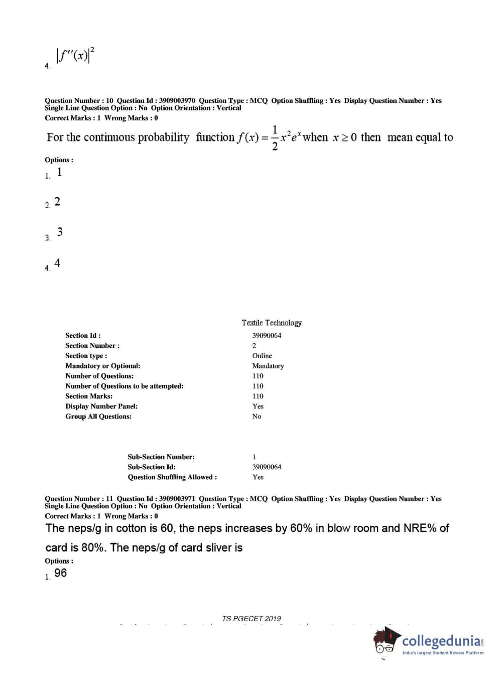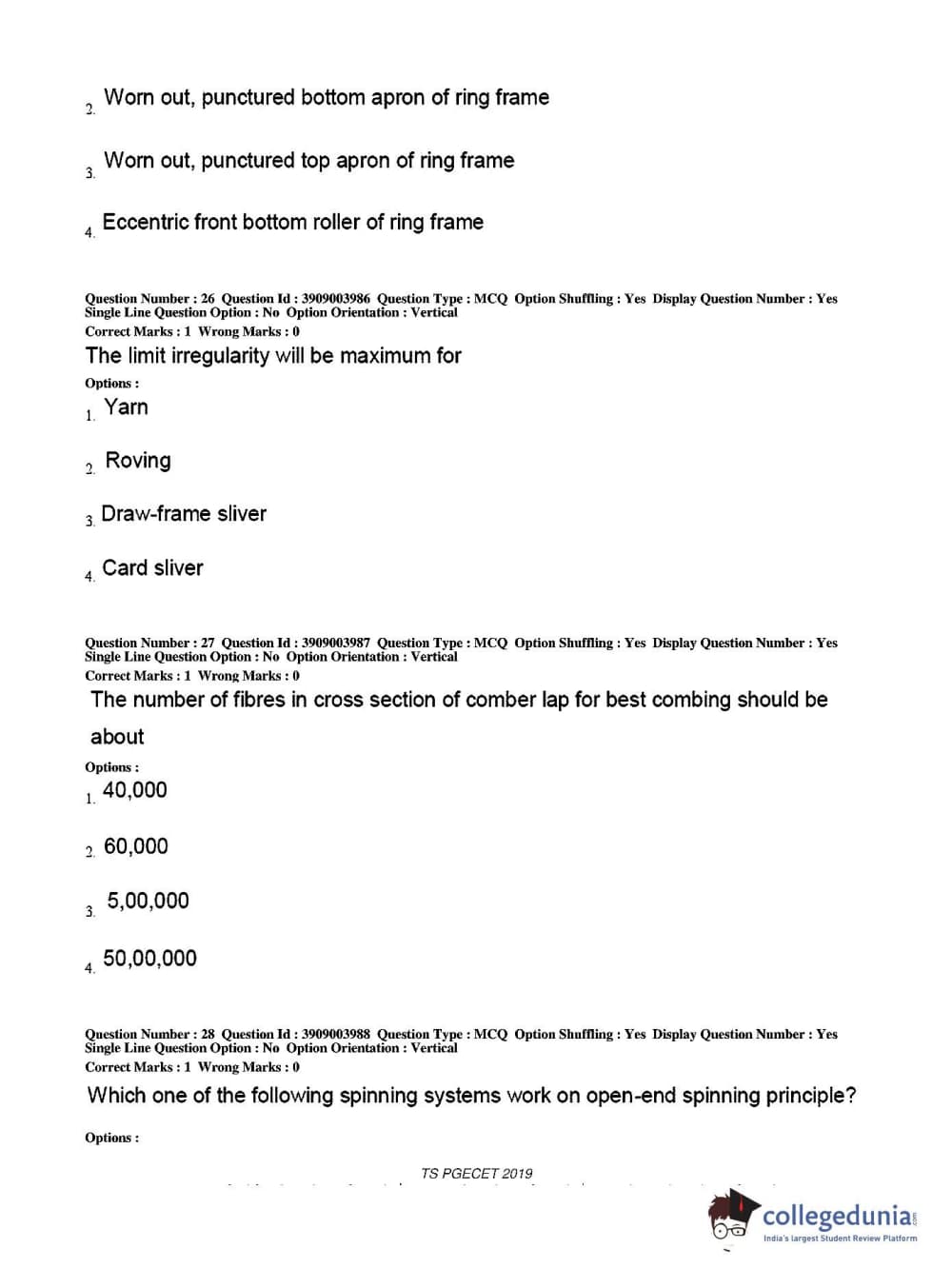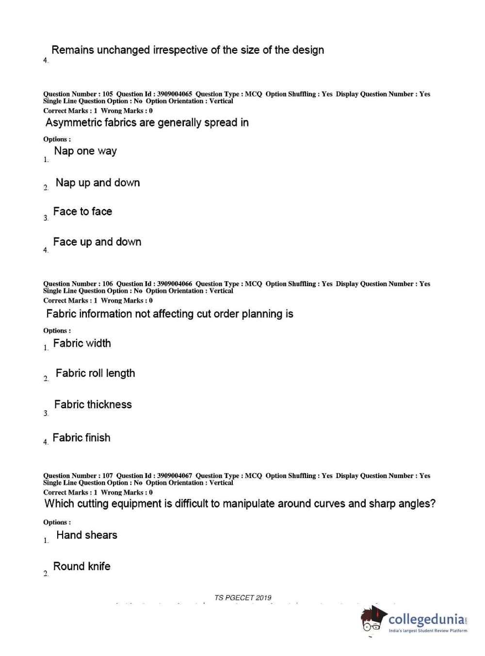 TS PGECET 2019 Textile Technology Question paper with answer key pdf conducted on May 28, 2019 from is available for download. The exam was successfully organized by Osmania University. The question paper comprised a total of 120 questions.