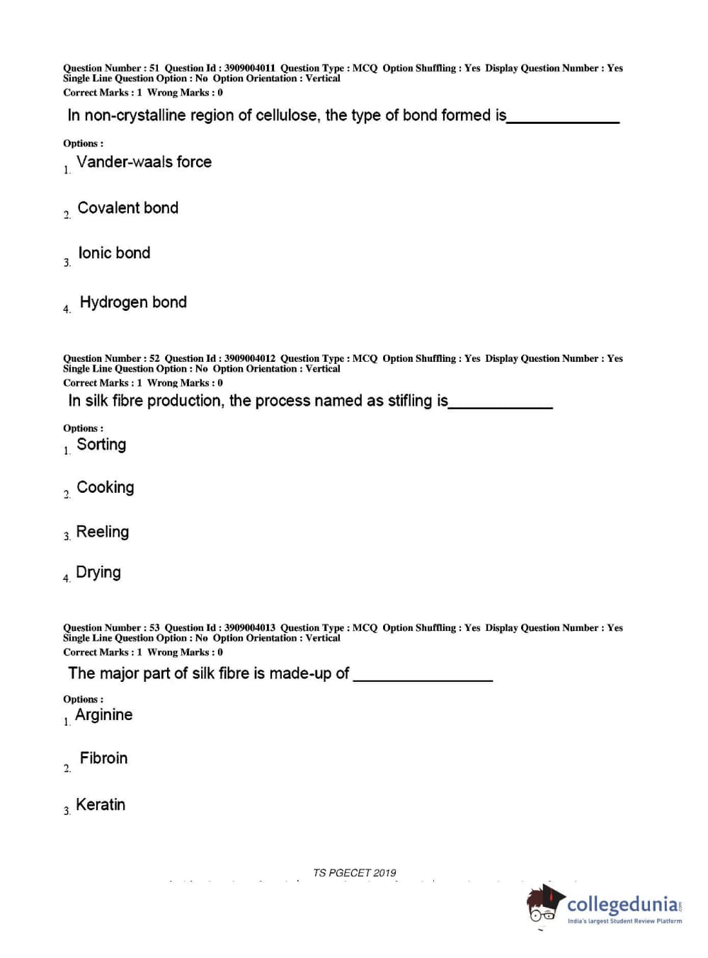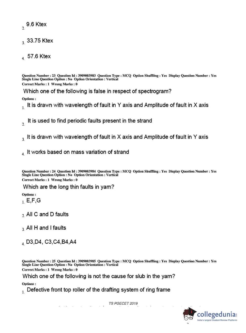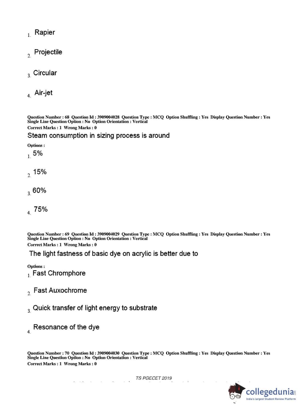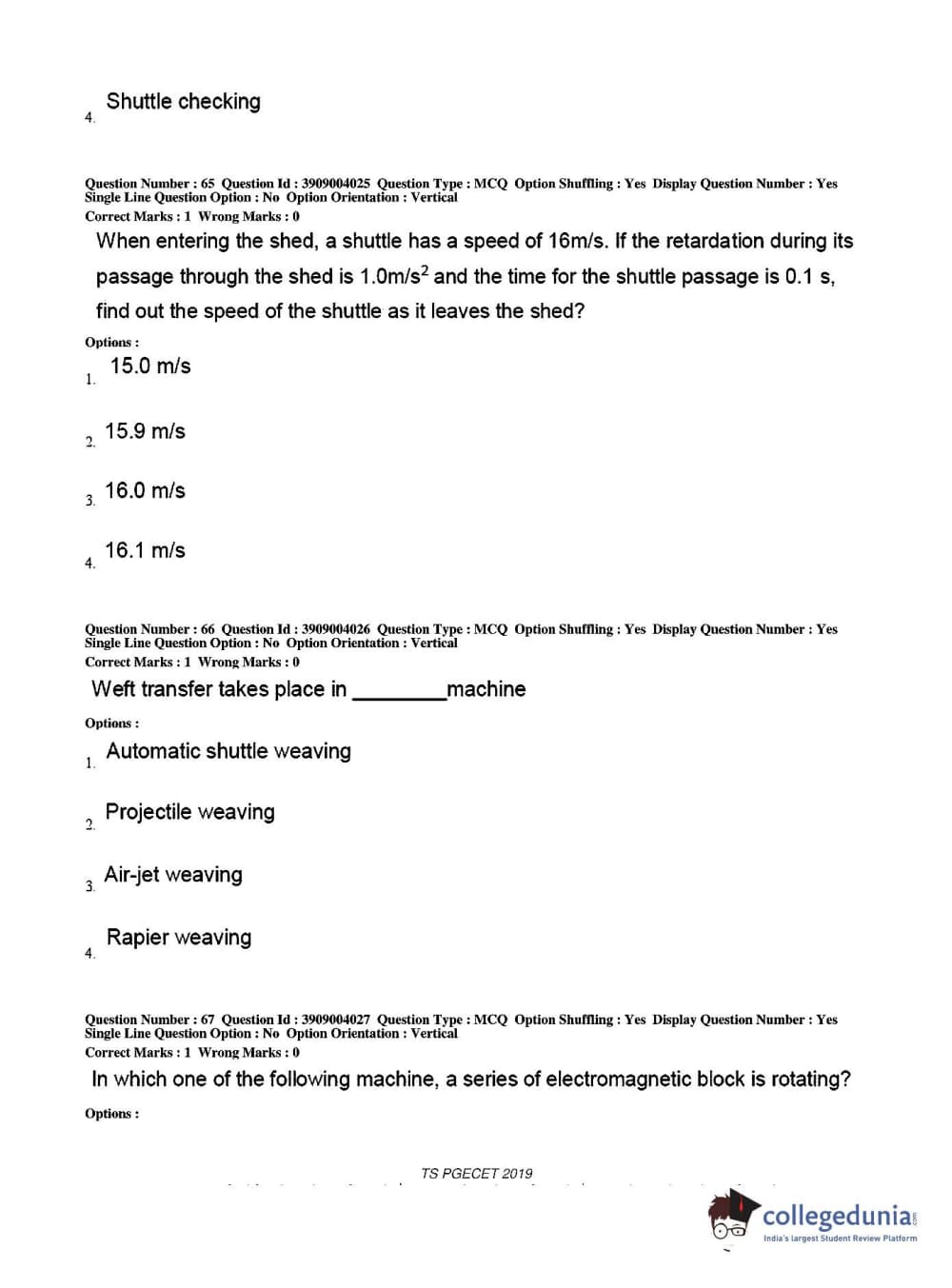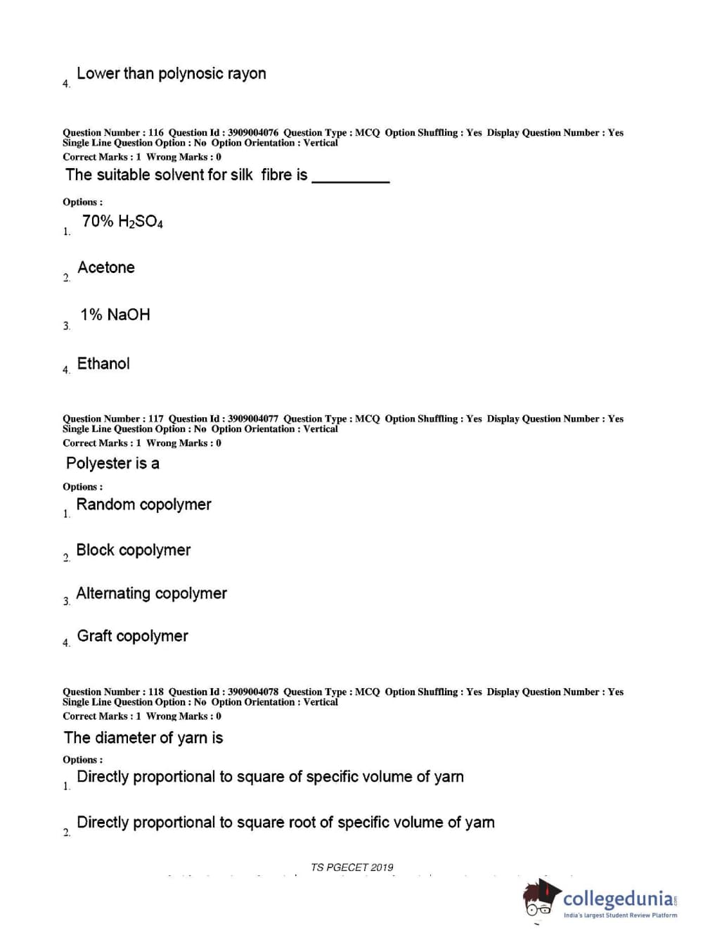 TS PGECET 2019 Textile Technology Question paper with answer key pdf conducted on May 28, 2019 from is available for download. The exam was successfully organized by Osmania University. The question paper comprised a total of 120 questions.
