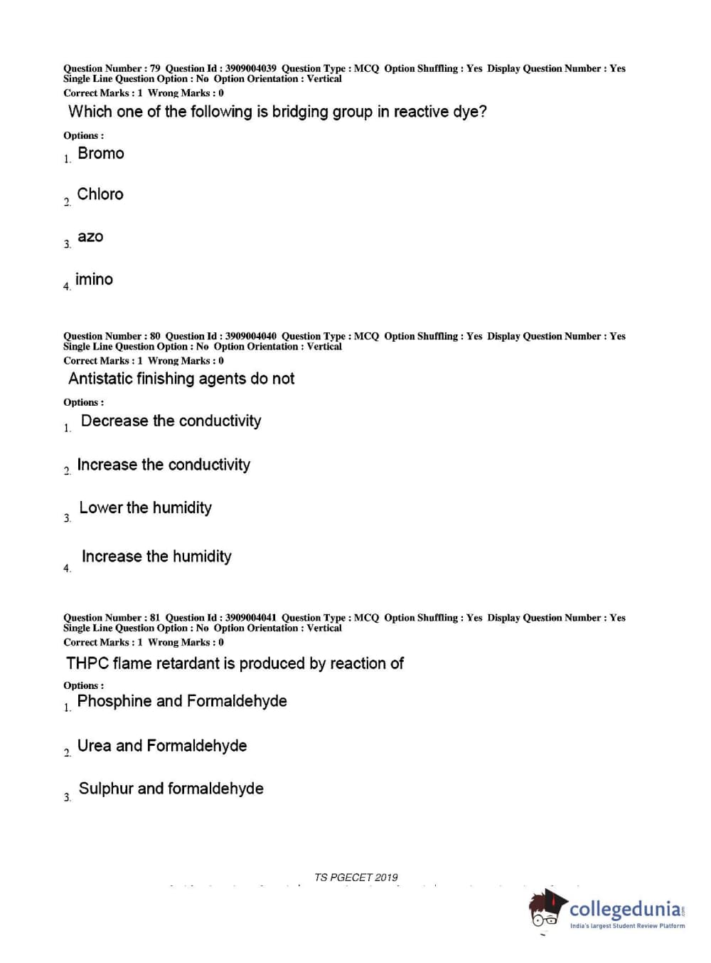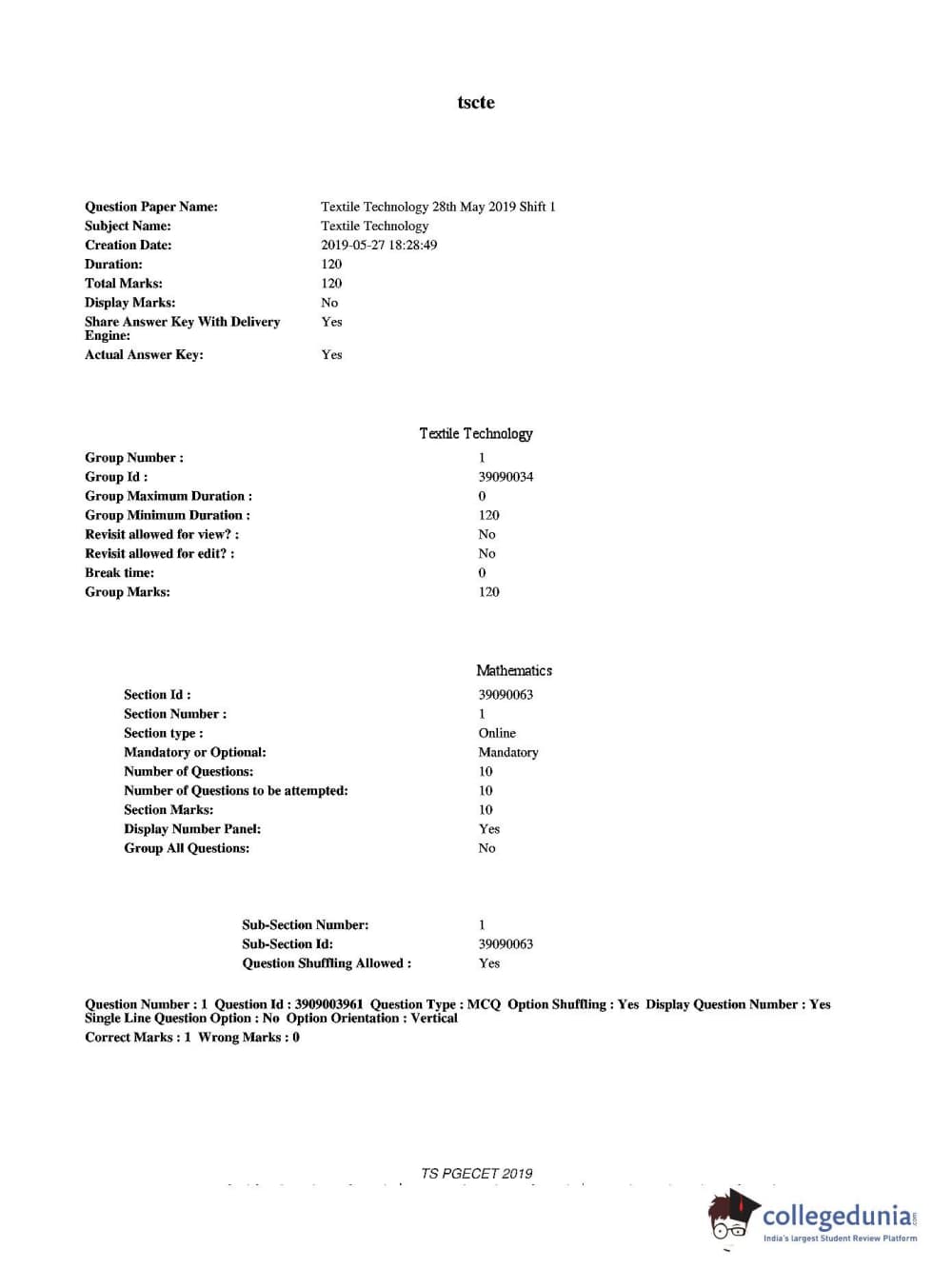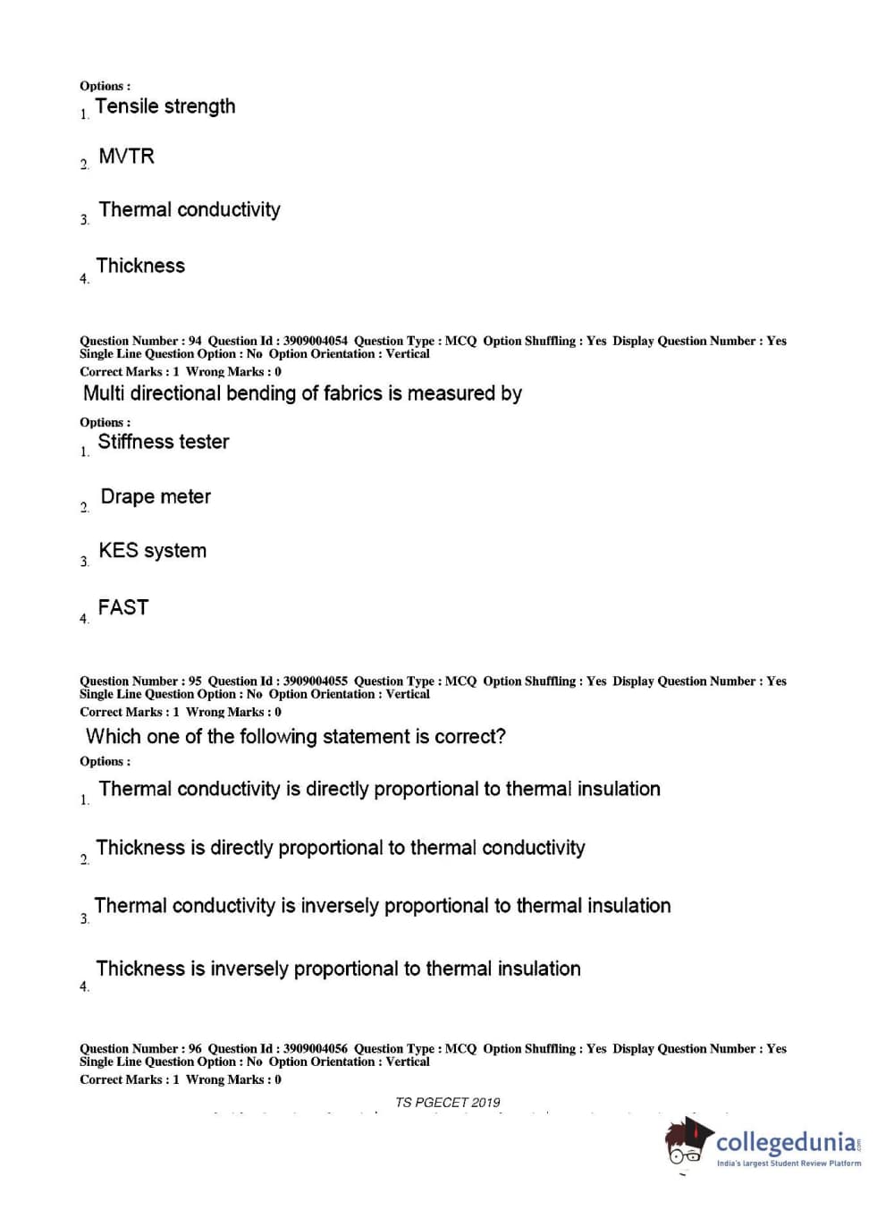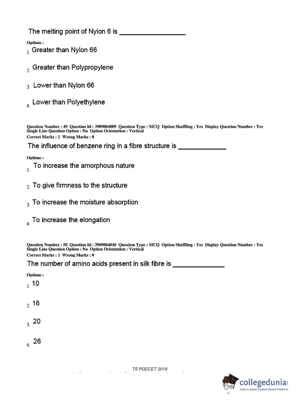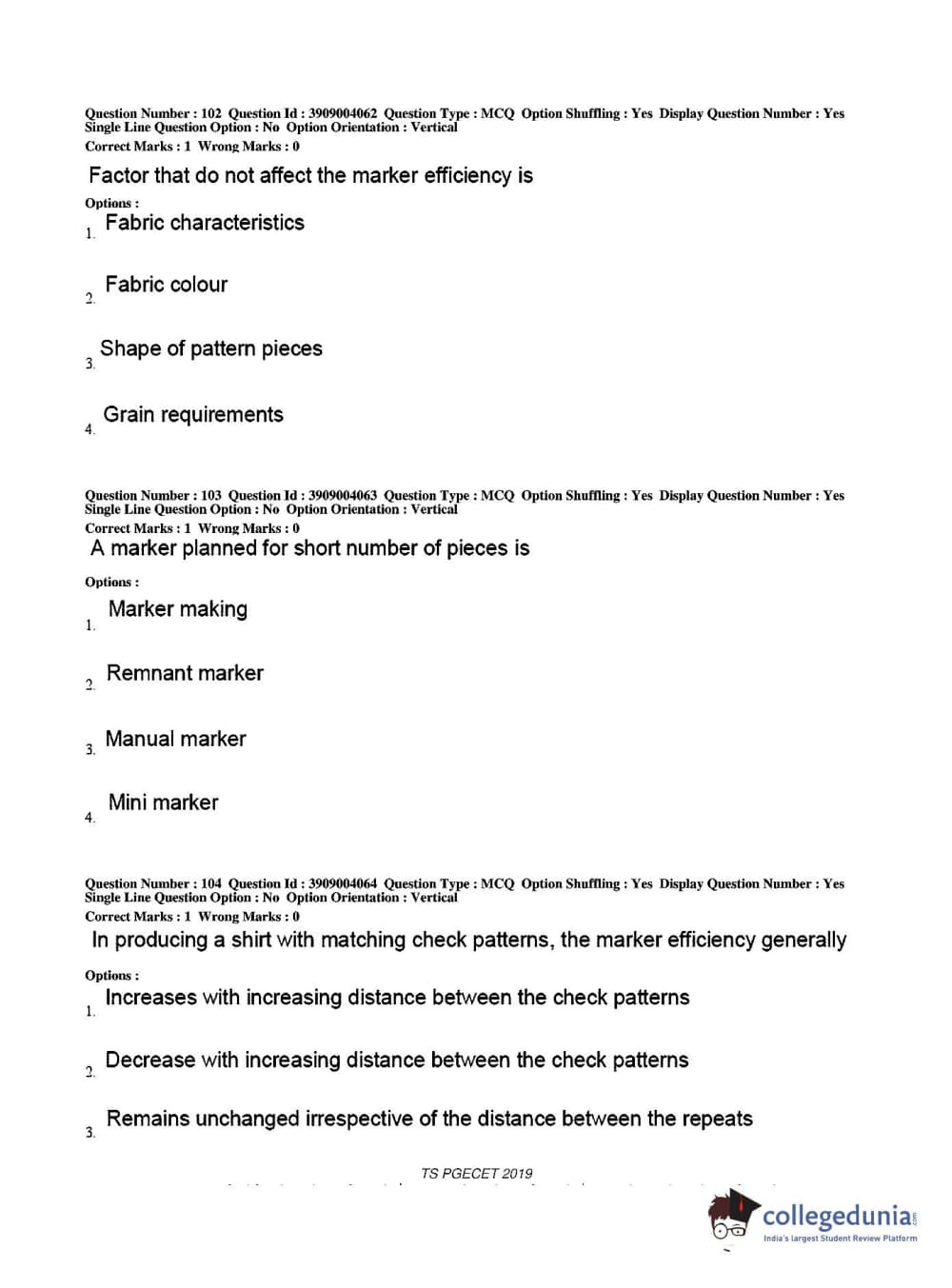 TS PGECET 2019 Textile Technology Question paper with answer key pdf conducted on May 28, 2019 from is available for download. The exam was successfully organized by Osmania University. The question paper comprised a total of 120 questions.