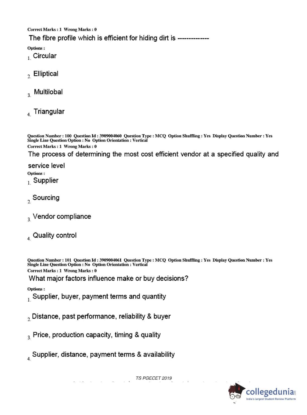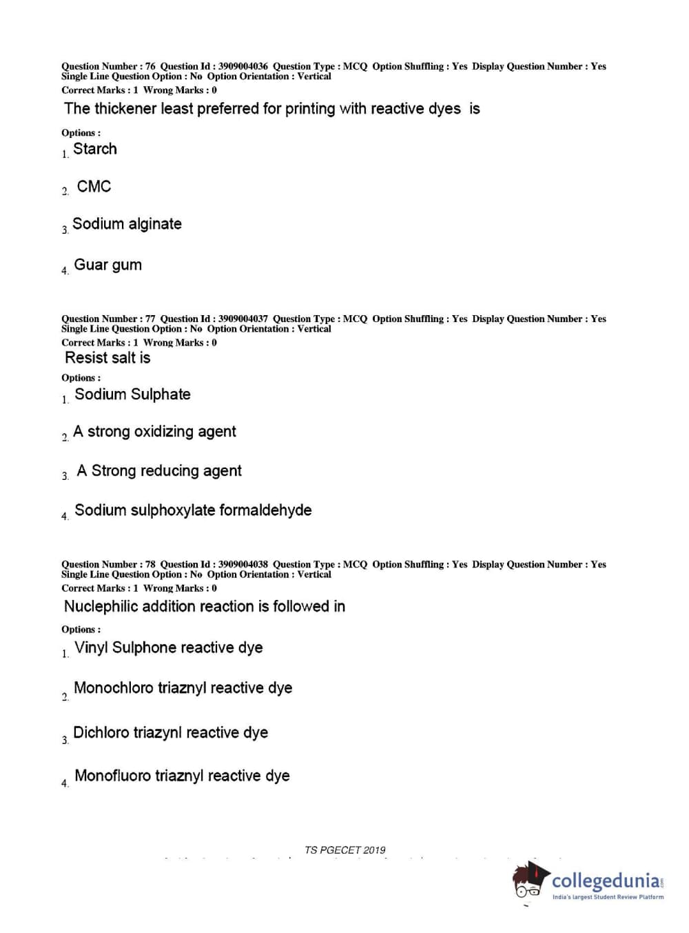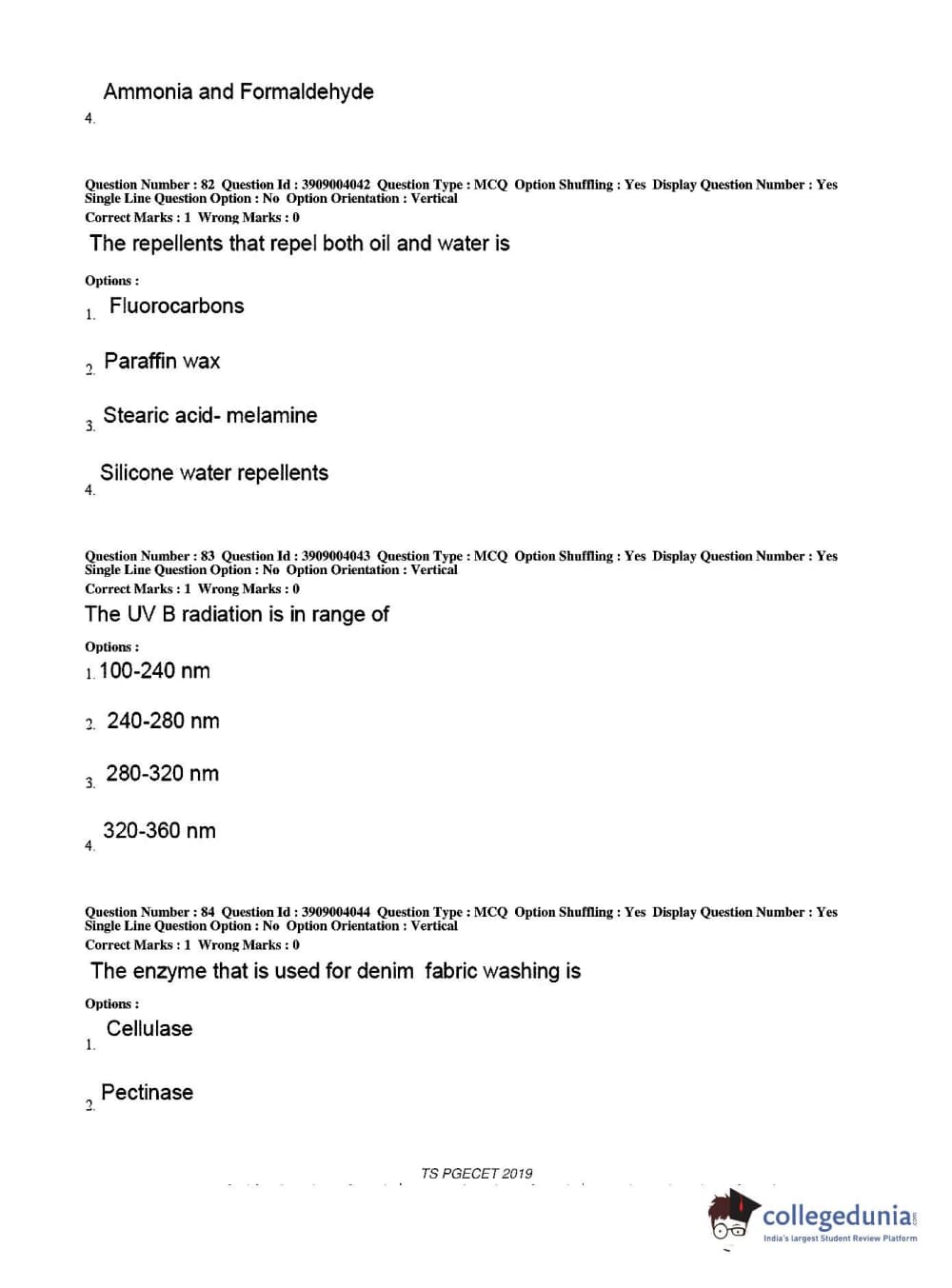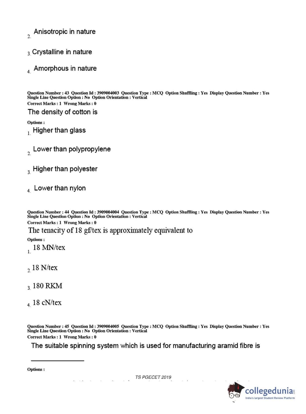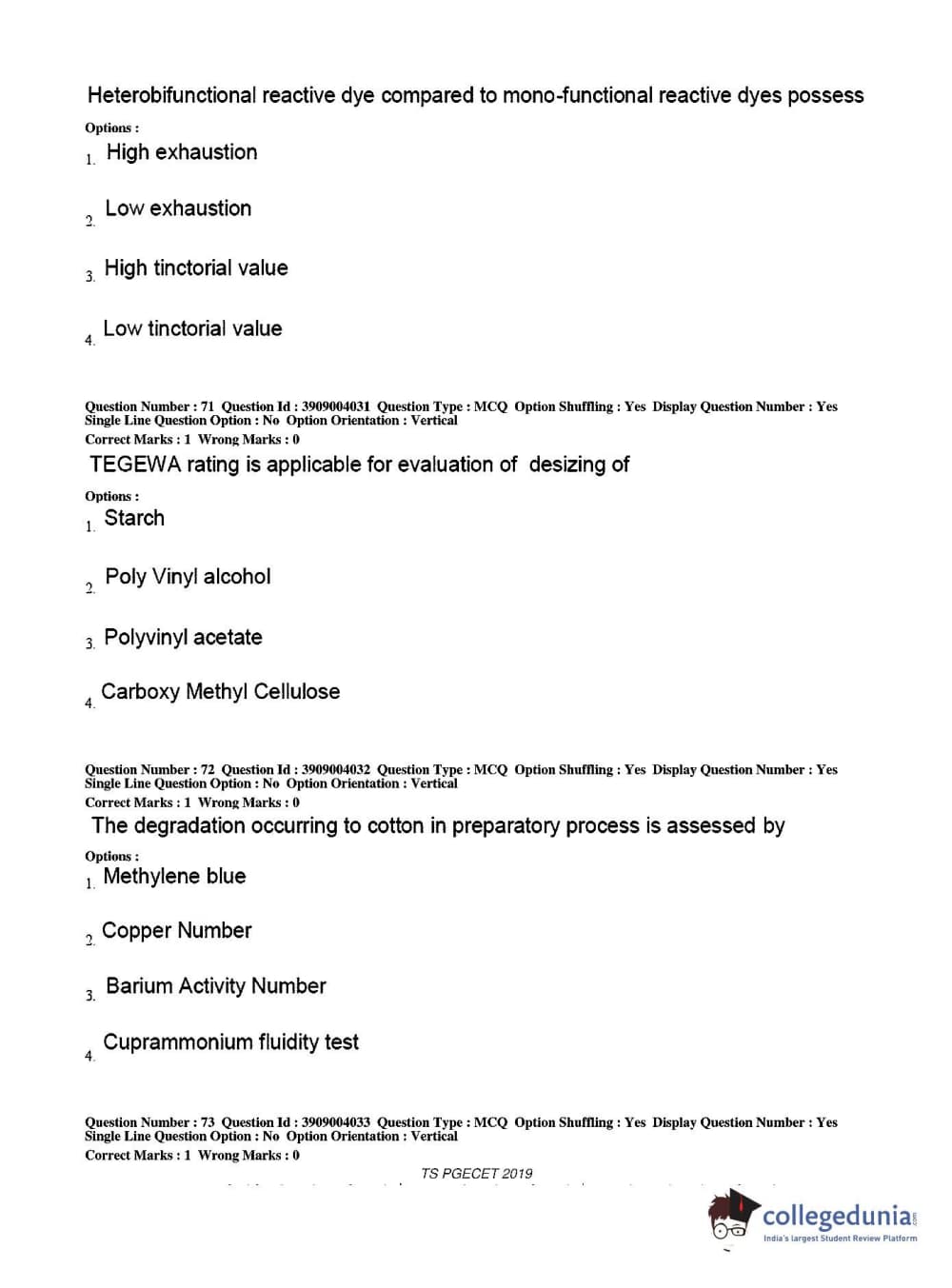 TS PGECET 2019 Textile Technology Question paper with answer key pdf conducted on May 28, 2019 from is available for download. The exam was successfully organized by Osmania University. The question paper comprised a total of 120 questions.