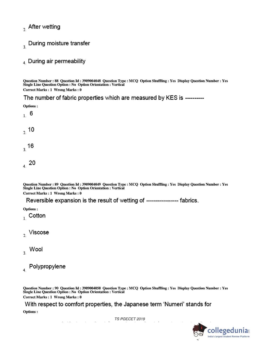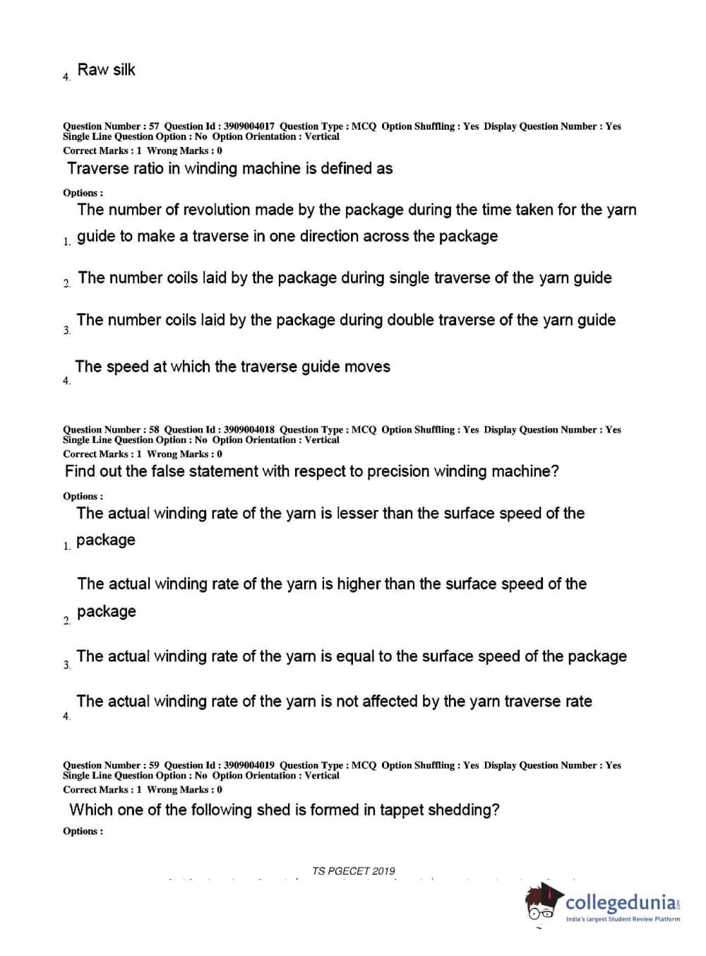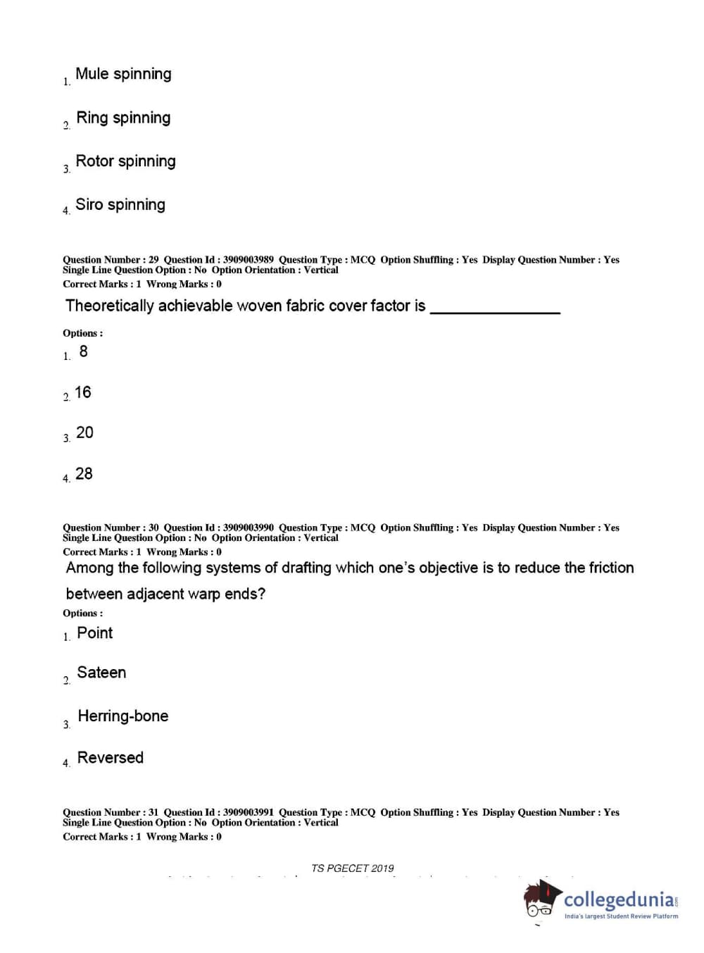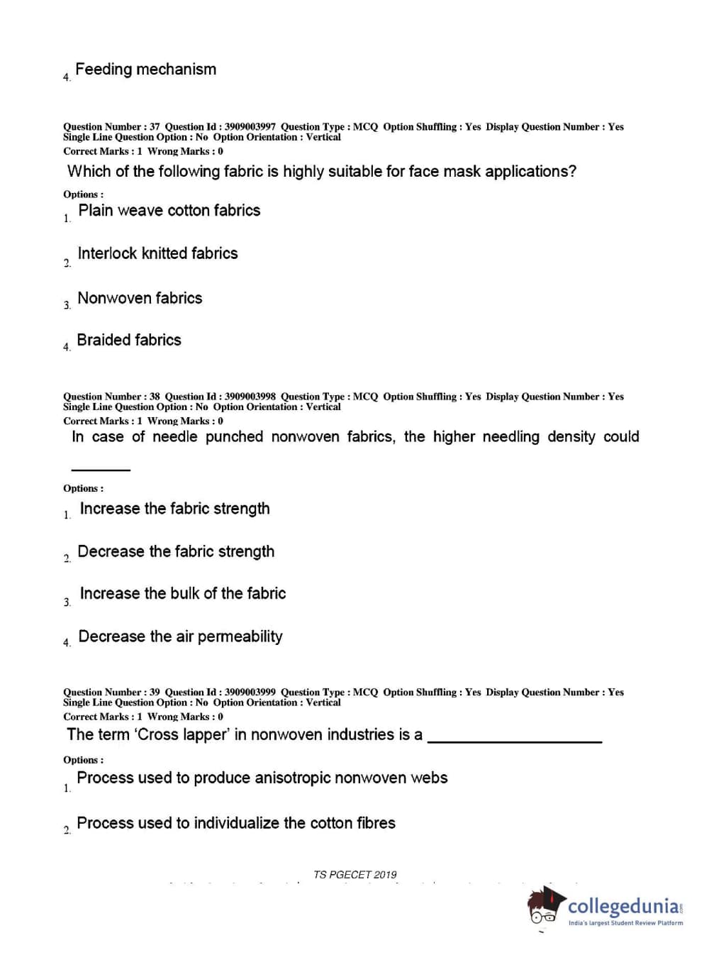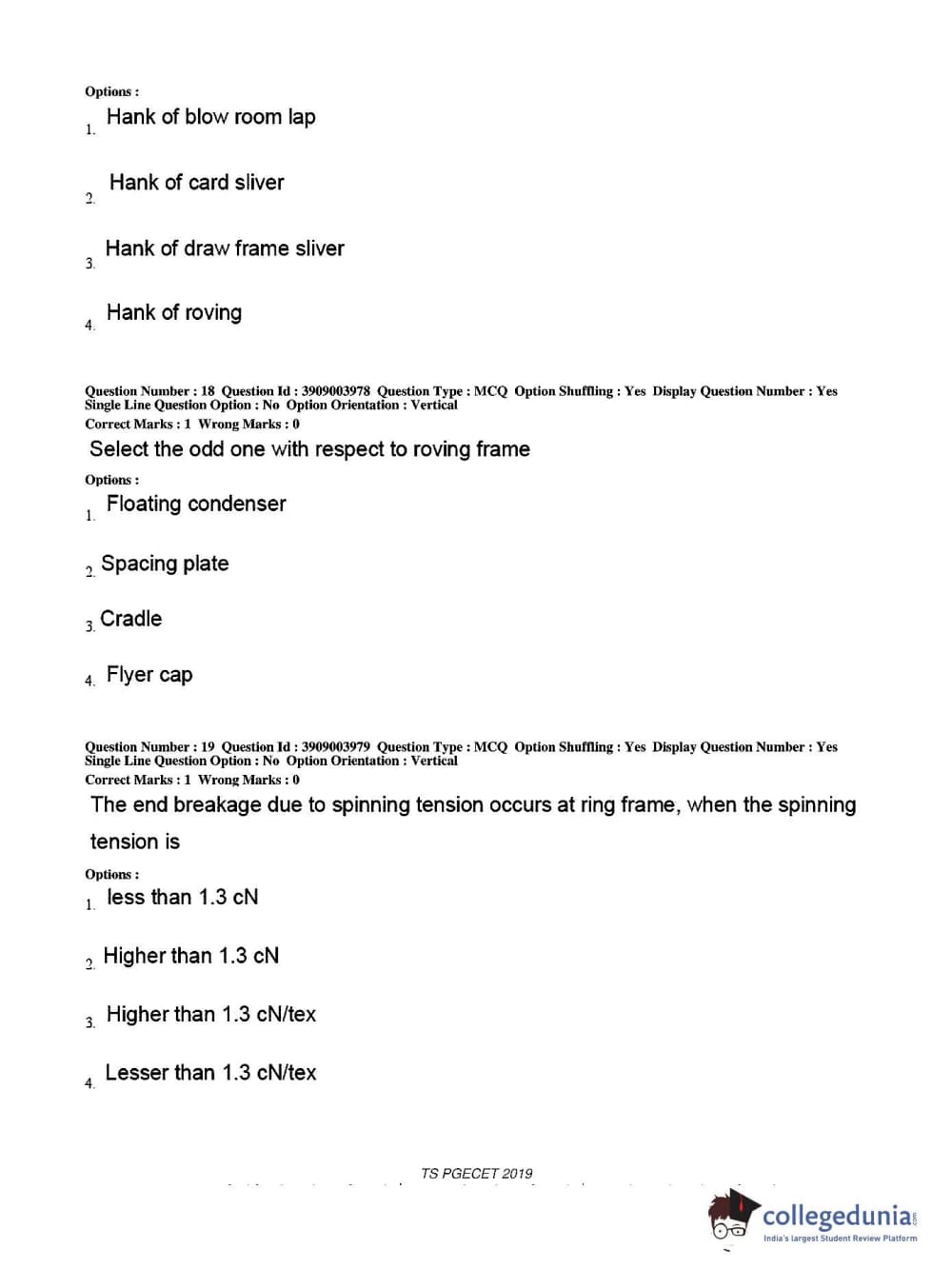 TS PGECET 2019 Textile Technology Question Paper with Answer Key PDF for