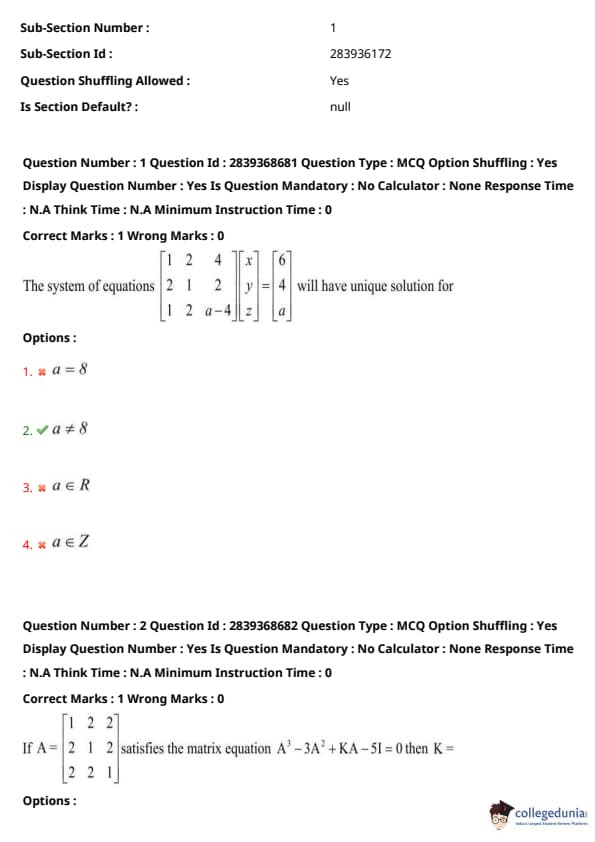 For unique solution: \[ -3a + 24 \neq 0 \] \[ \Rightarrow a \neq 8 \] Quick Tip: To check for unique solutions in a system of linear equations, always test if the determinant of the coefficient matrix is non-zero. A zero determinant means no or infinitely many solutions.