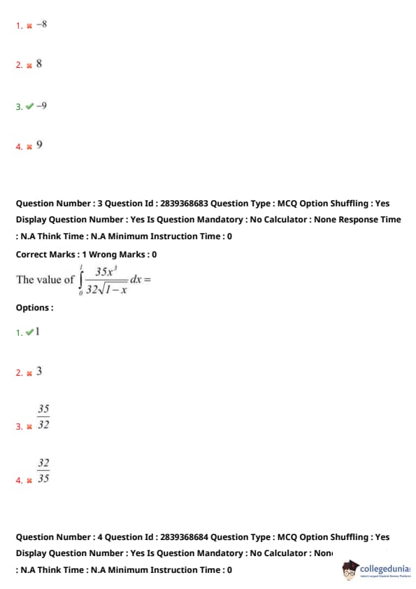 Now: \[ I = \frac{35}{32} \times \frac{6 \times \sqrt{\pi}}{\frac{105 \sqrt{\pi}}{16}} = \frac{35}{32} \times \frac{6 \times 16}{105} = \frac{35}{32} \times \frac{96}{105} = \frac{3360}{3360} = 1 \] Quick Tip: When integrating expressions of the form \( x^m (1-x)^n \) over \([0,1]\), consider using the Beta function for a quicker solution.