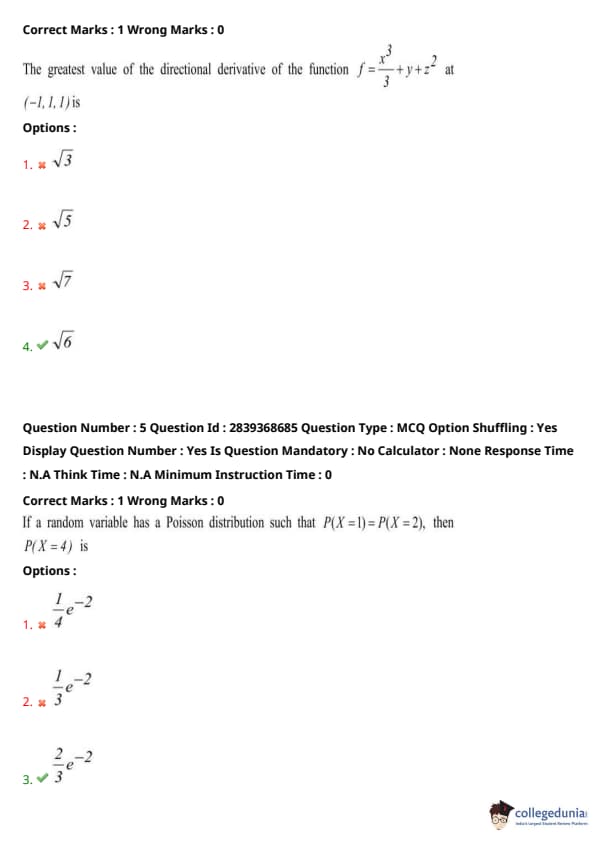 Now, find \( P(X=4) \) \[ P(X=4) = \frac{e^{-2} 2^4}{4!} = \frac{e^{-2} \times 16}{24} = \frac{2}{3} e^{-2} \] Quick Tip: For Poisson distribution problems, use the standard probability formula carefully and equate probabilities as given in the question to find the unknown parameter.