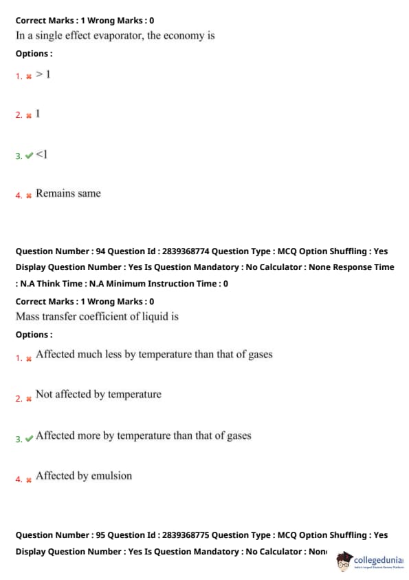 Step 2: In a single effect evaporator, this is usually less than 1 due to energy losses. Quick Tip: Multi-effect evaporators are used to increase economy beyond 1 by using vapor from one effect as heating medium for the next.