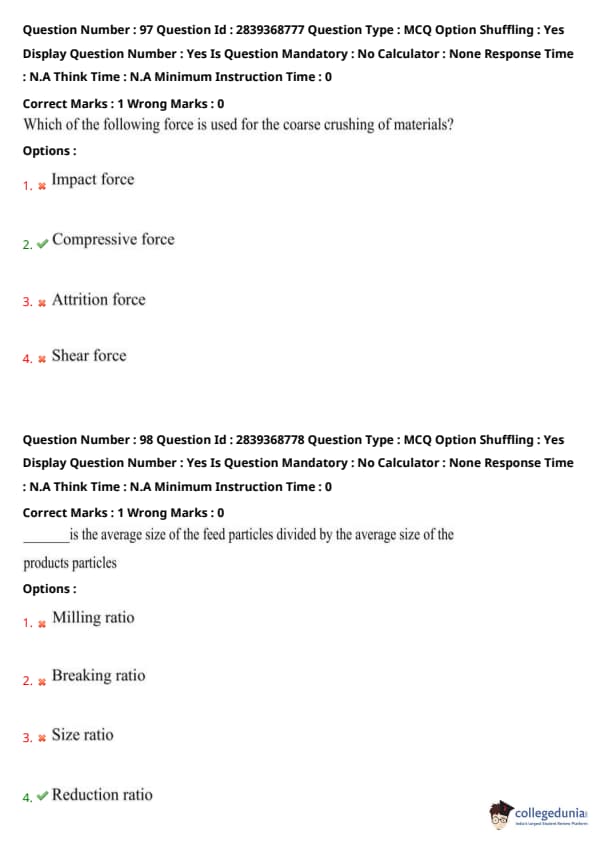 Step 2: It is calculated as the ratio of the average feed size to the average product size. Quick Tip: Higher reduction ratio means more efficient size reduction.