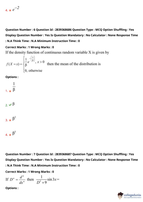 Hence, the mean of this distribution is \( \beta \). Quick Tip: For an exponential distribution with pdf \( f(x) = \frac{1}{\beta} e^{-x/\beta} \), the mean is always \( \beta \) and variance is \( \beta^2 \).