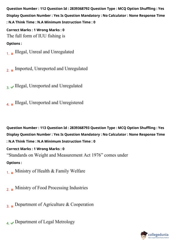 Step 2: The acronym stands for Illegal, Unreported and Unregulated fishing, and it includes activities that violate conservation or management measures. Quick Tip: IUU fishing = Illegal, Unreported, Unregulated — key focus area in marine conservation.