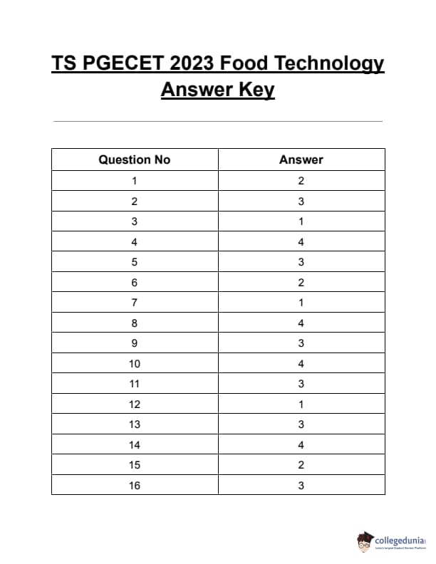 TS PGECET 2023 Food Technology Question Paper with Answer key PDF is available here for download. TS PGECET 2023 was conducted by JNTU Hyderabad on behalf of TSCHE on May 29, 2023. TS PGECET 2023 FT Question Paper consisted of 120 questions carrying 1 mark for each.