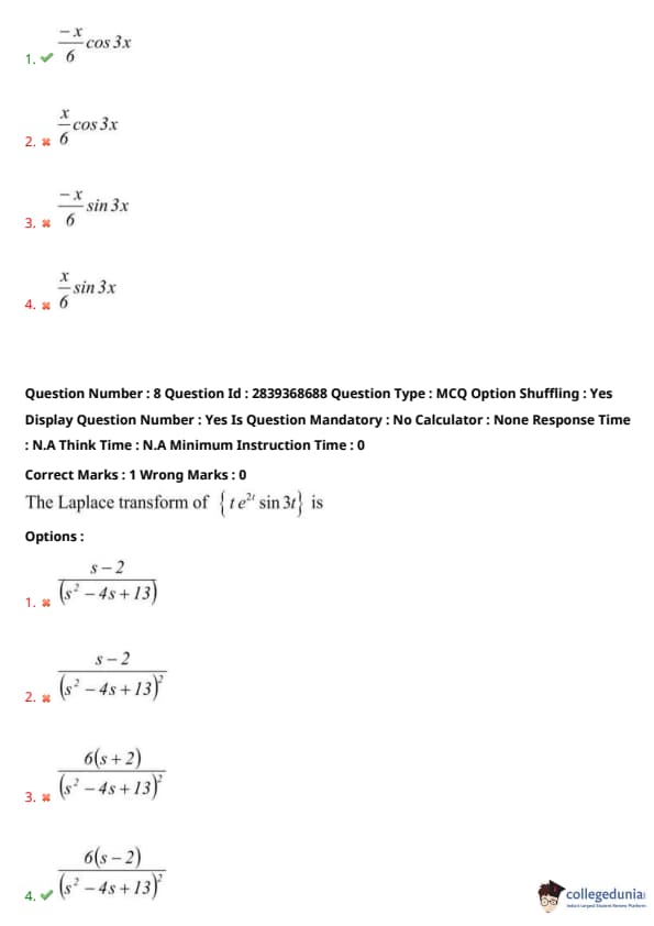 But the denominator becomes zero, so apply the method of inverse operators for repeated roots: \[ = \frac{x}{2 \cdot 3} \cdot \frac{\cos 3x}{3} = \frac{-x}{6} \cos 3x \] Quick Tip: When the auxiliary equation has a repeated root (like here \( D^2+9=0 \) for \( \sin 3x \)), use the method of inverse operators with an \( x \) multiplier to find a particular integral.