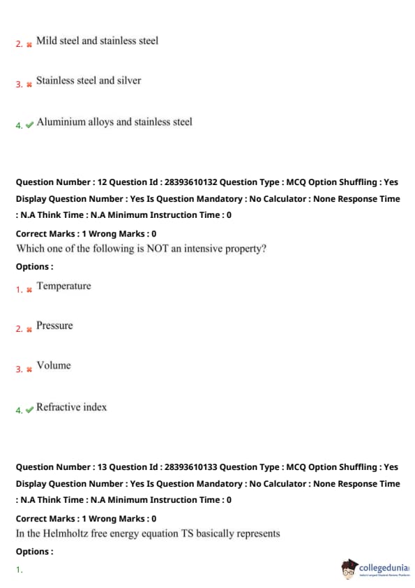Intensive properties are independent of the amount of substance, while extensive properties depend on it. Temperature, pressure, and refractive index are intensive, as they remain constant regardless of system size (e.g., temperature of water is the same for 1 mL or 1 L). Volume is extensive, as it scales with the amount of substance (e.g., doubling the material doubles the volume). Thus, volume (option 3) is not intensive. Quick Tip: Intensive properties (e.g., temperature, pressure) are independent of system size. Extensive properties (e.g., volume, mass) scale with quantity. Test by checking if doubling the substance changes the property.