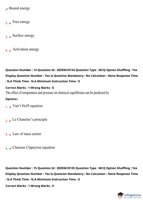 Le Chatelier's principle predicts how a chemical equilibrium shifts in response to temperature or pressure changes (e.g., higher pressure favors fewer gas moles, higher temperature favors endothermic reactions). The Van't Hoff equation quantifies temperature effects on the equilibrium constant but not pressure. The law of mass action defines the equilibrium constant, not its response to changes. The Clausius-Clapeyron equation applies to phase equilibria (e.g., vapor pressure vs. temperature), not chemical reactions. Thus, Le Chatelier's principle (option 2) is correct. Quick Tip: Use Le Chatelier's principle for qualitative predictions of equilibrium shifts due to temperature, pressure, or concentration. Use Van't Hoff for quantitative temperature effects and Clausius-Clapeyron for phase equilibria.