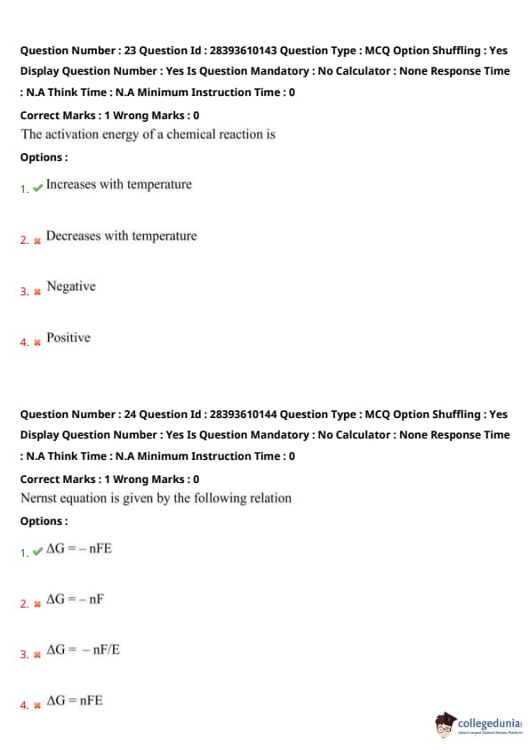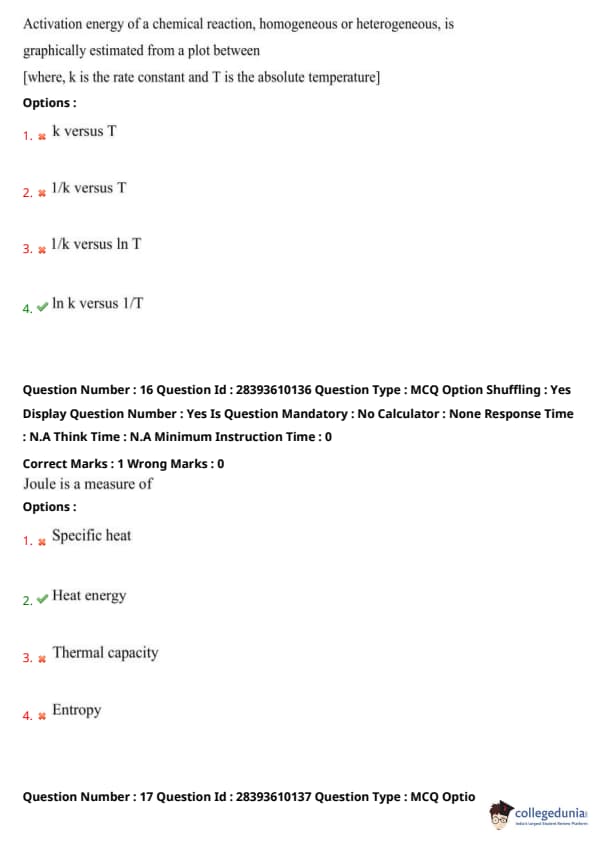 Plotting \(\ln k\) versus \(\frac{1}{T}\) gives a straight line with slope \(-\frac{E_a}{R}\), from which \(E_a\) is calculated. Other options (e.g., \(k\) vs. \(T\)) yield nonlinear plots, unsuitable for direct \(E_a\) estimation. Thus, option 4 is correct. Quick Tip: Use the Arrhenius equation \(k = A e^{-E_a / RT}\). Plot \(\ln k\) vs. \(1/T\) for a straight line, with slope \(-\frac{E_a}{R}\) giving the activation energy. Use Kelvin for temperatures.