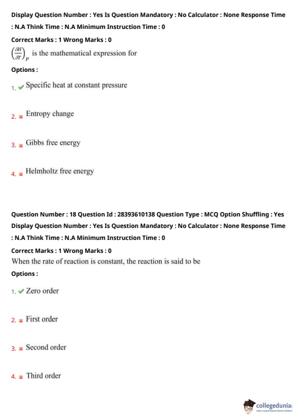 Enthalpy is \(H = U + PV\). The specific heat at constant pressure is \(C_p = \left( \frac{\partial H}{\partial T} \right)_P\), the heat required to raise a unit mass by 1 K at constant pressure. The expression \(\frac{\partial H}{\partial P}\) likely contains a typo, intending \(\left( \frac{\partial H}{\partial T} \right)_P\). For \(\left( \frac{\partial H}{\partial P} \right)_T = V + P \left( \frac{\partial V}{\partial P} \right)_T\), which is zero for ideal gases but nonzero for non-ideal systems, not matching any option directly. Entropy change, Gibbs free energy (\(G = H - TS\)), and Helmholtz free energy (\(A = U - TS\)) are unrelated. Assuming the intended expression, option 1 is correct. Quick Tip: Specific heat at constant pressure is \(C_p = \left( \frac{\partial H}{\partial T} \right)_P\). For \(\frac{\partial H}{\partial P}\), use \(\left( \frac{\partial H}{\partial P} \right)_T = V + P \left( \frac{\partial V}{\partial P} \right)_T\). Verify partial derivative notation in thermodynamic questions.