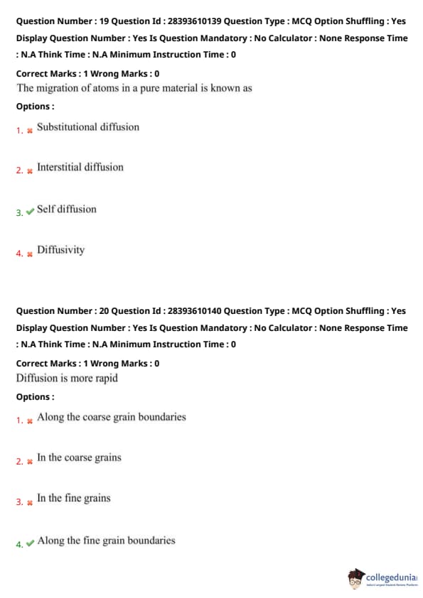 Self-diffusion is the random movement of atoms in a pure material (e.g., copper atoms in pure copper), typically via vacancies. Substitutional diffusion involves impurity atoms replacing host atoms. Interstitial diffusion involves smaller atoms moving through lattice gaps. Diffusivity is a measure of diffusion rate (\(m^2/s\)), not the process. In a pure material, migration is self-diffusion (option 3). Quick Tip: Self-diffusion occurs in pure materials where identical atoms migrate, often via vacancies. Distinguish from substitutional (impurity atoms) and interstitial (small atoms in gaps) diffusion.