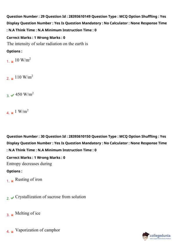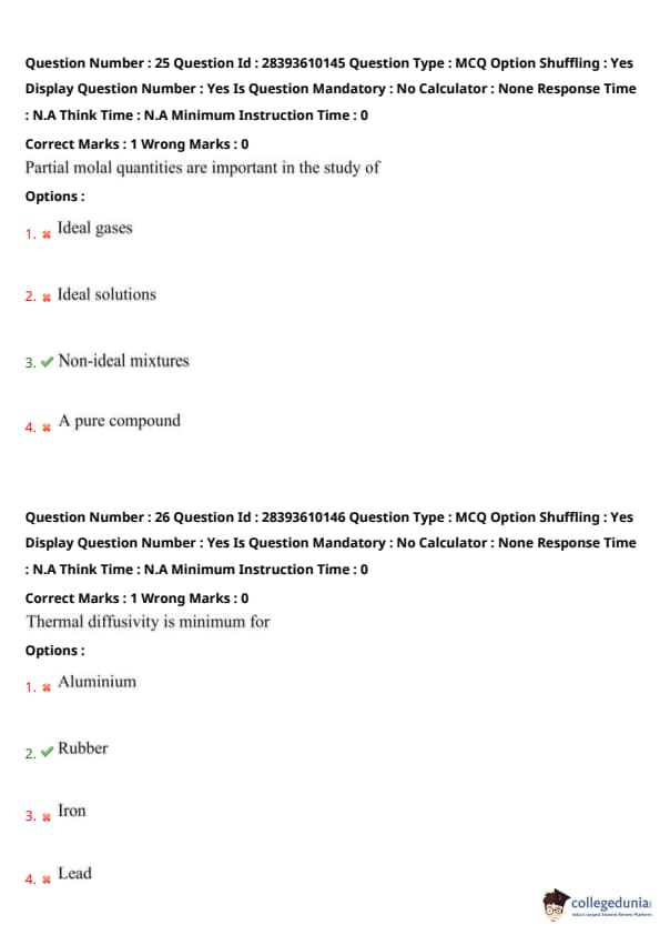 A joule (J) is the SI unit of energy (\(1 \, J = 1 \, kg \cdot m^2 / s^2\)). Heat energy, the energy transferred due to temperature differences, is measured in joules. Specific heat is in \(J/(kg \cdot K)\), thermal capacity in \(J/K\), and entropy in \(J/K\). Thus, heat energy (option 2) is directly measured in joules. Quick Tip: A joule measures energy, including heat energy. Distinguish from derived units like \(J/(kg \cdot K)\) for specific heat or \(J/K\) for entropy and thermal capacity by checking the quantity’s definition.