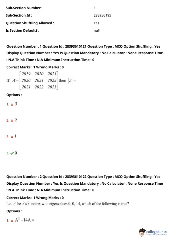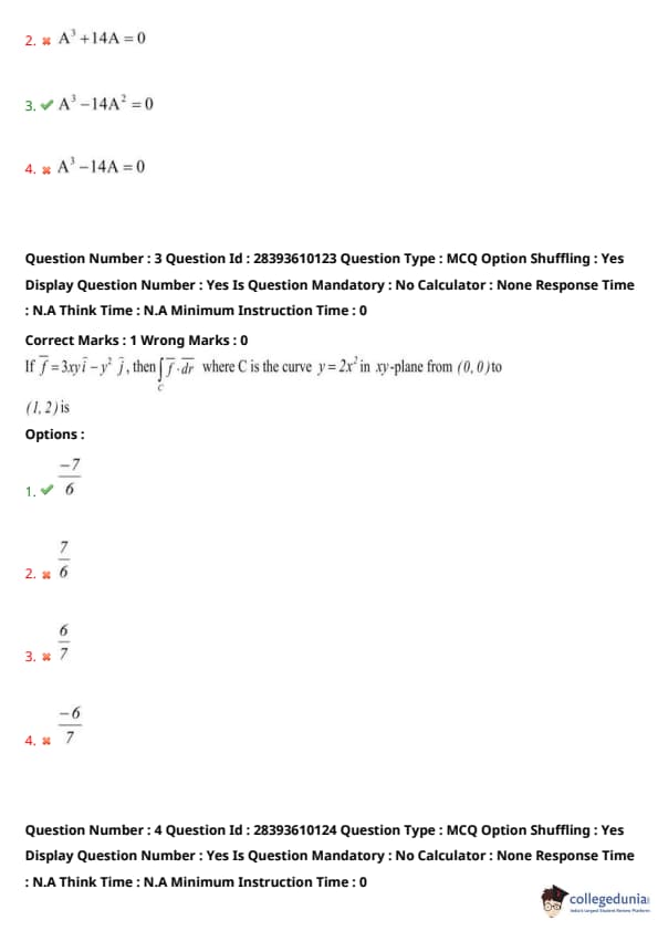 This matches option (3). Other options fail (e.g., for option (4), \( A^3 - 14A = 0 \), test \( \lambda = 14 \): \( 14^3 - 14 \cdot 14 = 2744 - 196 = 2548 \neq 0 \)). Quick Tip: Use the Cayley-Hamilton theorem to form the characteristic polynomial from the eigenvalues. Substitute the matrix \( A \) to find the matrix equation. Verify by testing each eigenvalue in the resulting polynomial to ensure it equals zero.