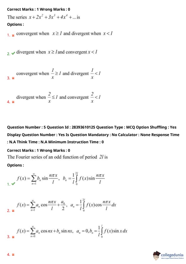 Thus, \(b_n\) matches the standard form. Options (2) and (3) include cosine terms, and option (4) uses incorrect sine arguments. Quick Tip: For odd functions with period \(2l\), the Fourier series contains only sine terms, as cosine terms vanish due to symmetry. Compute coefficients over \([-l, l]\) or \([0, 2l]\), using even/odd properties to simplify integrals to \([0, l]\).