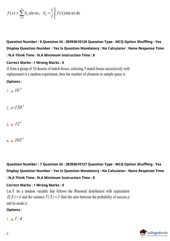 Other options misinterpret the number of matchboxes: \(10^5\) assumes 10 matchboxes, \(12^5\) assumes one dozen (12 matchboxes), and \(102^5\) is likely a typo. Hence, the correct answer is \(120^5\). Quick Tip: For sampling with replacement, the sample space size is \(n^k\), where \(n\) is the number of choices per trial and \(k\) is the number of trials. Ensure clarity in units (e.g., ``dozens'' means 12 items) to correctly determine \(n\).