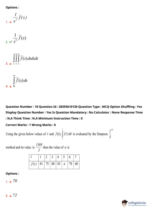 Thus, \(\mathcal{L}\{g(t)\} = \frac{F(s)}{s^4}\). Options (3) and (4) incorrectly involve s-domain integrals. Quick Tip: The Laplace transform of an \(n\)-fold integral of \(f(t)\) is \(\frac{F(s)}{s^n}\). Verify by applying the integral property iteratively, matching the number of integrations to the power of \(s\).