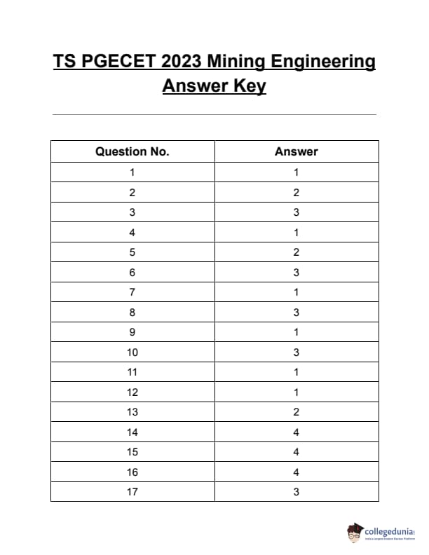 TS PGECET 2023 Mining Engineering Question Paper with Answer key PDF is available here for download. TS PGECET 2023 was conducted by JNTU Hyderabad on behalf of TSCHE on May 31, 2023. TS PGECET 2023 MN Question Paper consisted of 120 questions carrying 1 mark for each.
