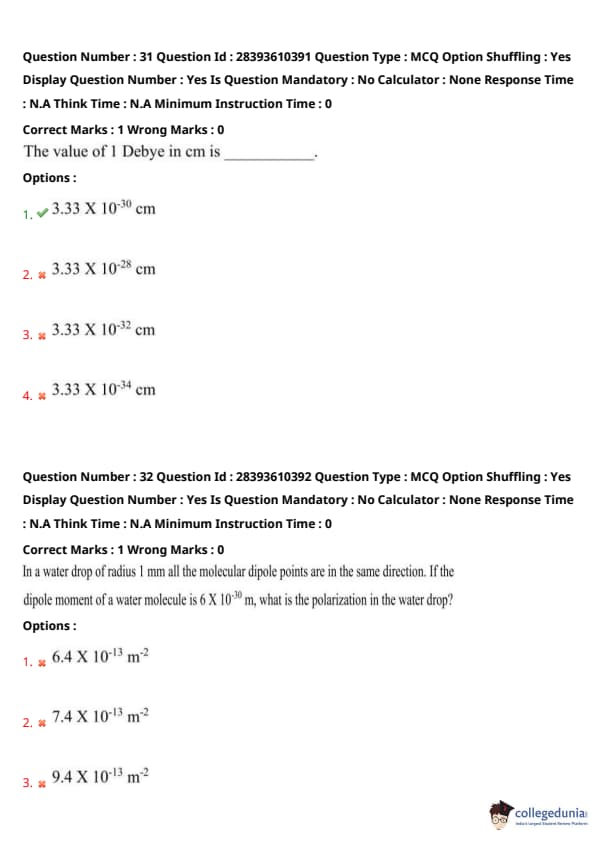 N/A Quick Tip: Remember: 1 Debye \(\approx 3.33 \times 10^{-30}\) cm — a common constant in dipole problems.