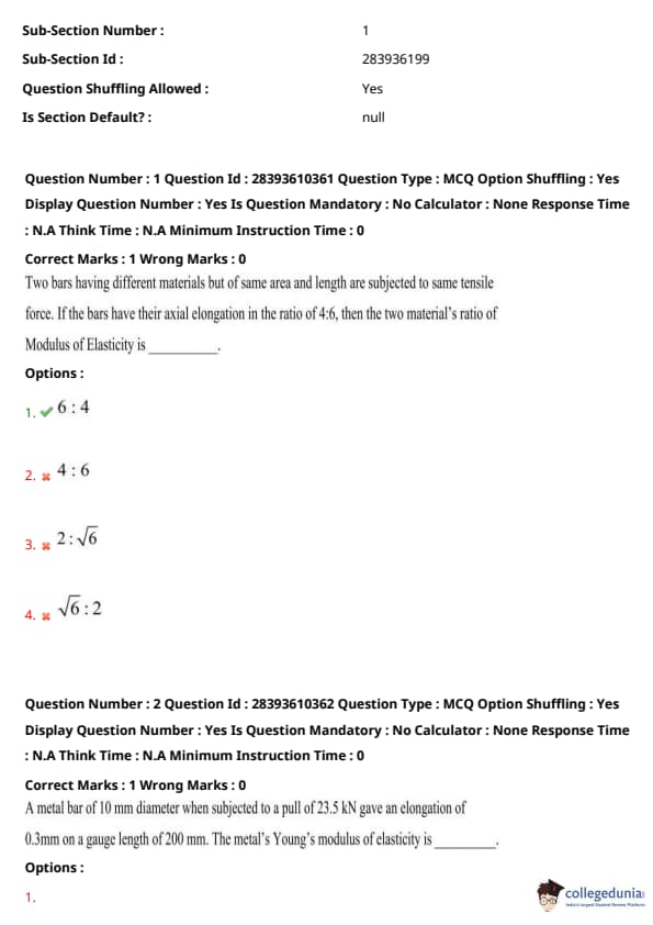 Two bars having different materials but of same area and length are subjected to same tensile force. If the bars have their axial elongation in the ratio of 4:6, then the two material’s ratio of Modulus of Elasticity is _________.