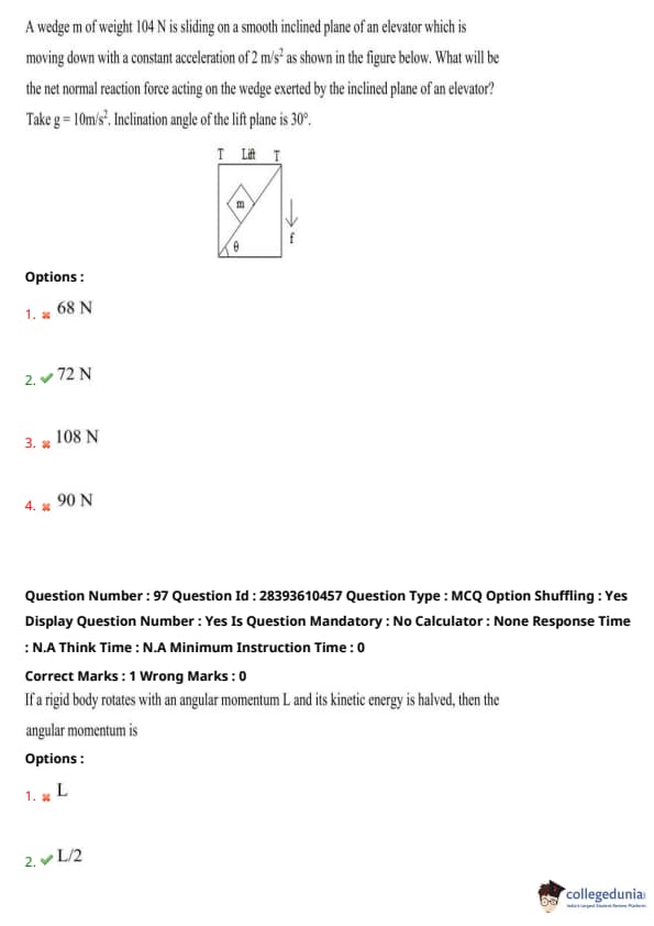 A wedge of mass 104 N is sliding on a smooth inclined plane of an elevator which is moving down with a constant acceleration of \( 2 \, m/s^2 \) as shown in the figure below. What will be the net normal reaction force acting on the wedge exerted by the inclined plane of an elevator? Take \( g = 10 \, m/s^2 \). Inclination angle of the lift plane is \( 30^\circ \).