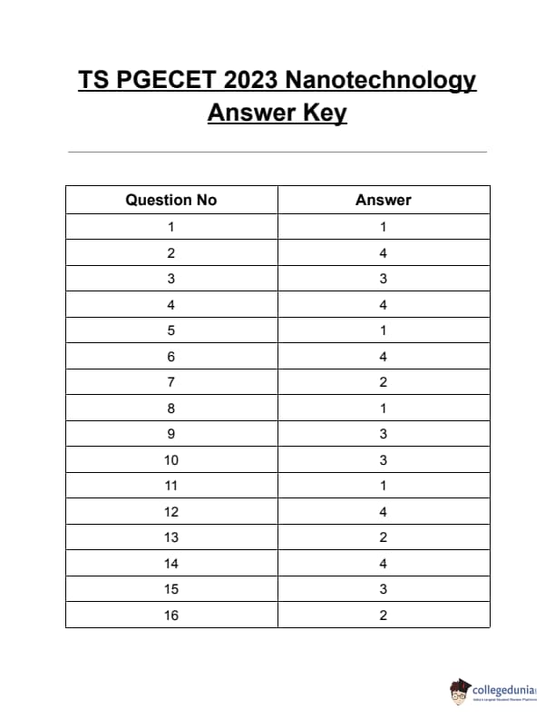 TS PGECET 2023 Nano Technology Question Paper with Answer key PDF is available here for download. TS PGECET 2023 was conducted by JNTU Hyderabad on behalf of TSCHE on June 1, 2023. TS PGECET 2023 NT Question Paper consisted of 120 questions carrying 1 mark for each.