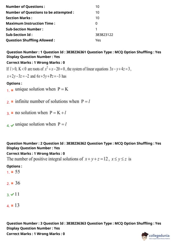 If \(l > 0, K < 0\) are roots of \(x^2 + x - 20 = 0\), the system of linear equations \(3x - y + 4z = 3\), \(x + 2y - 3z = -2\) and \(6x + 5y + Pz = -3\) has?