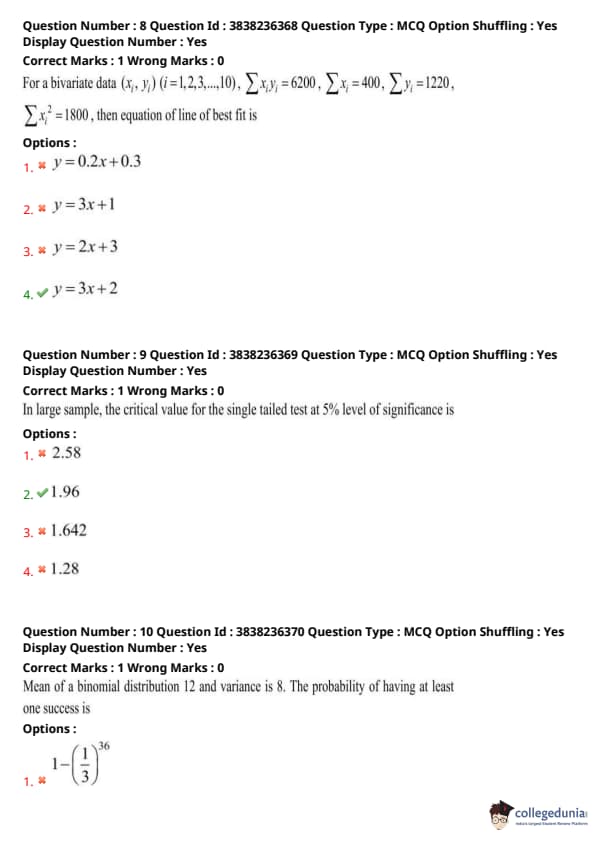 For a bivariate data \((x_i, y_i)\) (\(i=1,2,3,\dots,10\)), \(\sum x_i y_i = 6200\), \(\sum x_i = 400\), \(\sum y_i = 1220\), \(\sum x_i^2 = 1800\), then equation of line of best fit is?