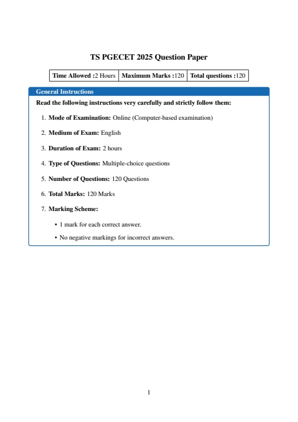 The TS PGECET consists of 120 Multiple Choice Questions (MCQs) to be solved in 120 minutes.
