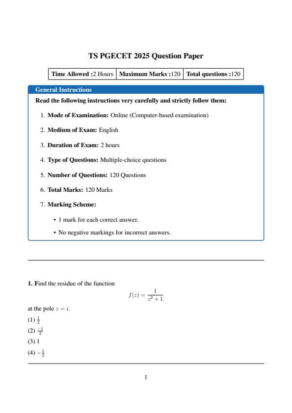 The TS PGECET 2025 Question Paper with Answer Key and Solution PDF is available here. It consists of 120 questions, each carrying one mark, with a total duration of 120 minutes. The exam was divided into different sections based on the respective branches of Engineering and Technology.
