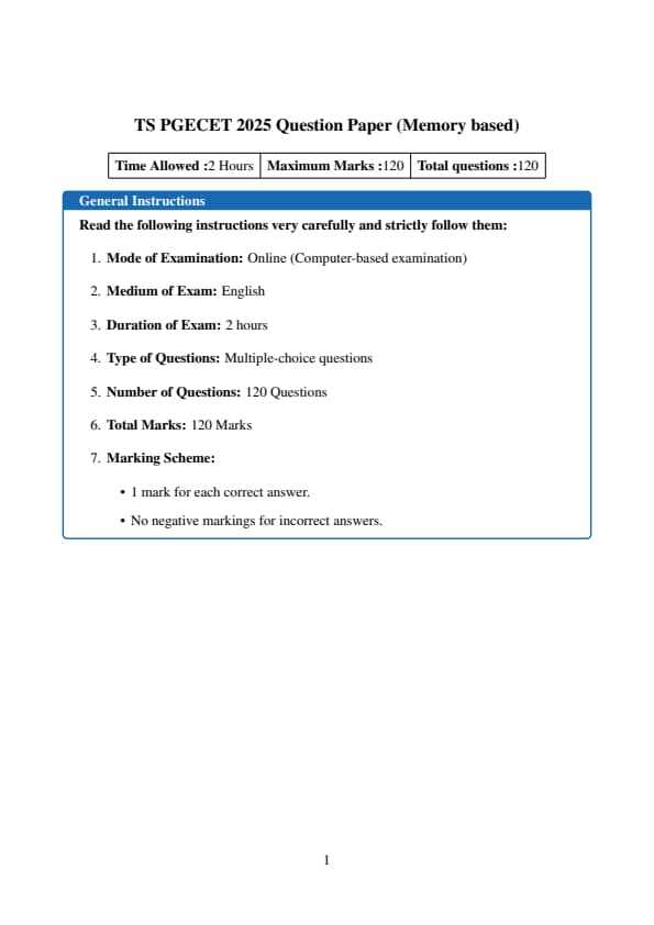 The TS PGECET consists of 120 Multiple Choice Questions (MCQs) to be solved in 120 minutes.