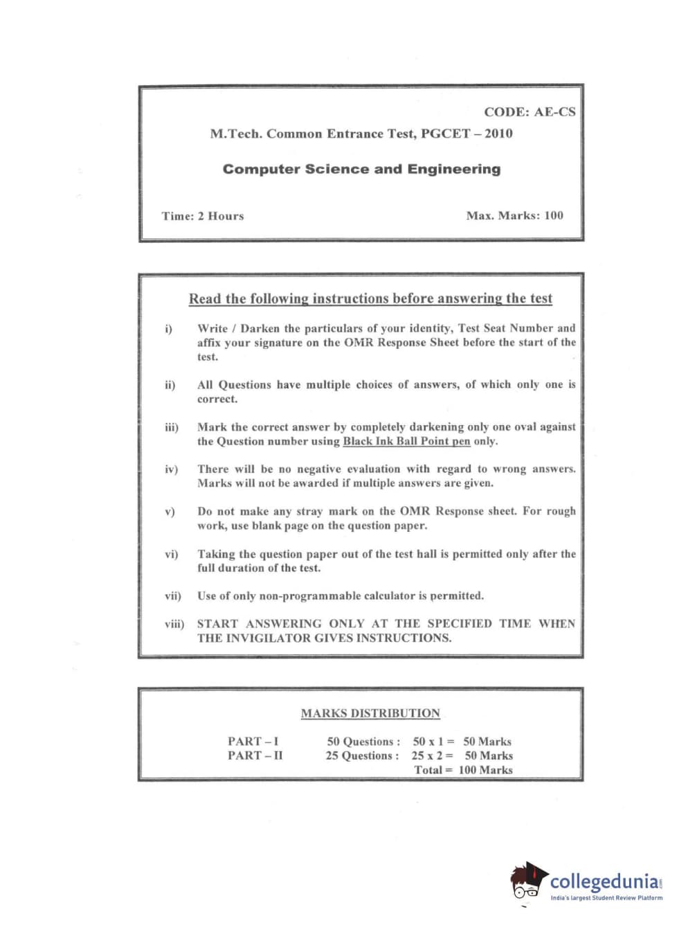 Karnataka PGCET 2010 Computer Science and Engineering Question paper with answer key pdf is available for download. The exam was successfully organized by Karnataka Examinations Authority (KEA). The question paper comprised a total of 75 questions.