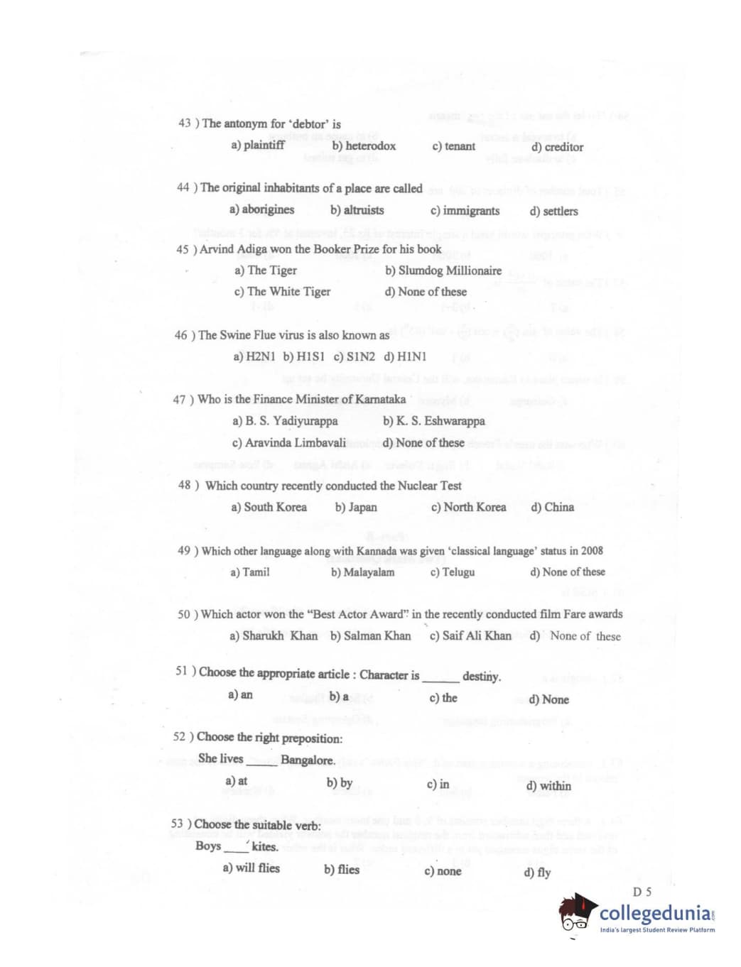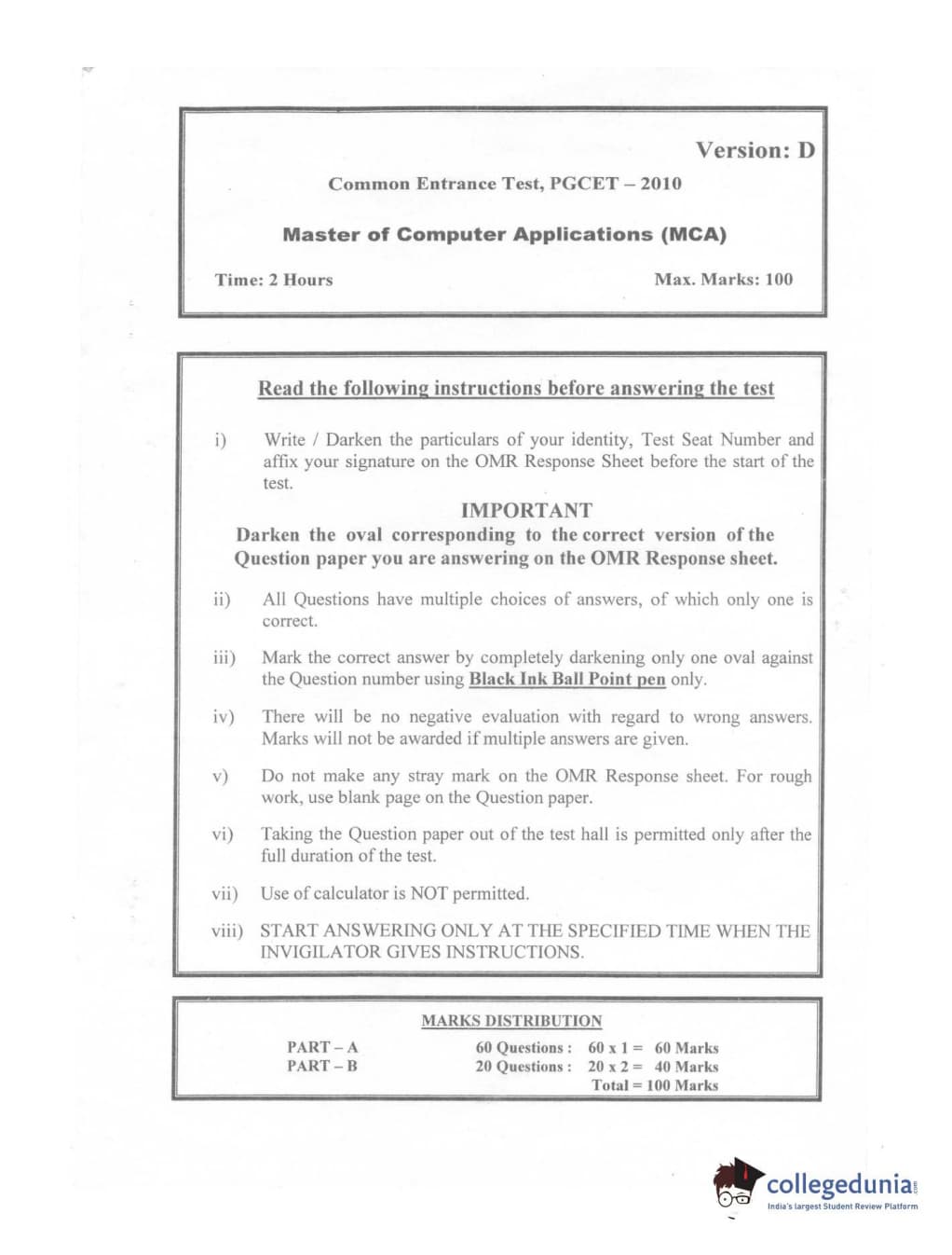 Karnataka PGCET 2010 MCA Question paper with answer key pdf is available for download. The exam was successfully organized by Karnataka Examinations Authority (KEA). The question paper comprised a total of 80 questions.