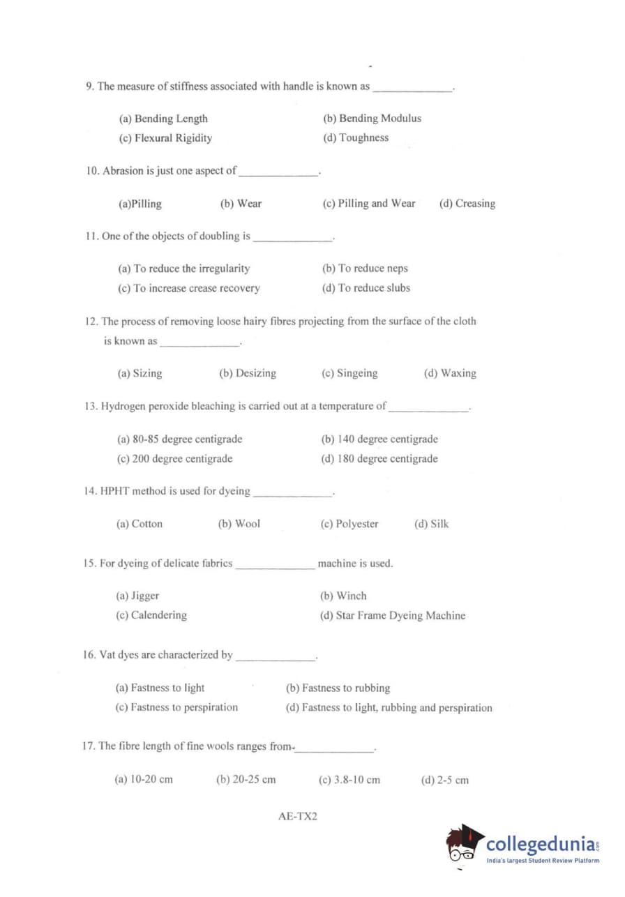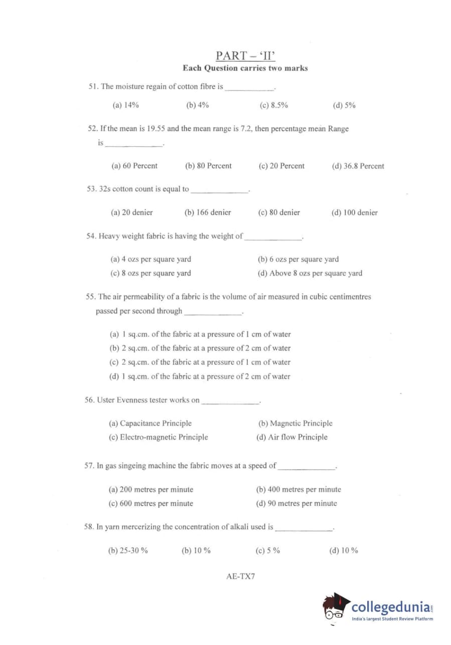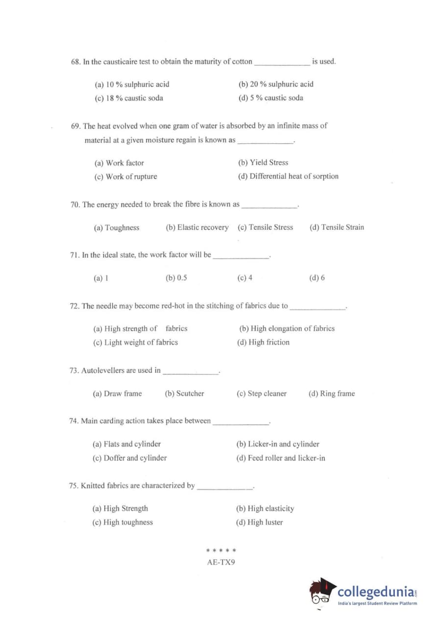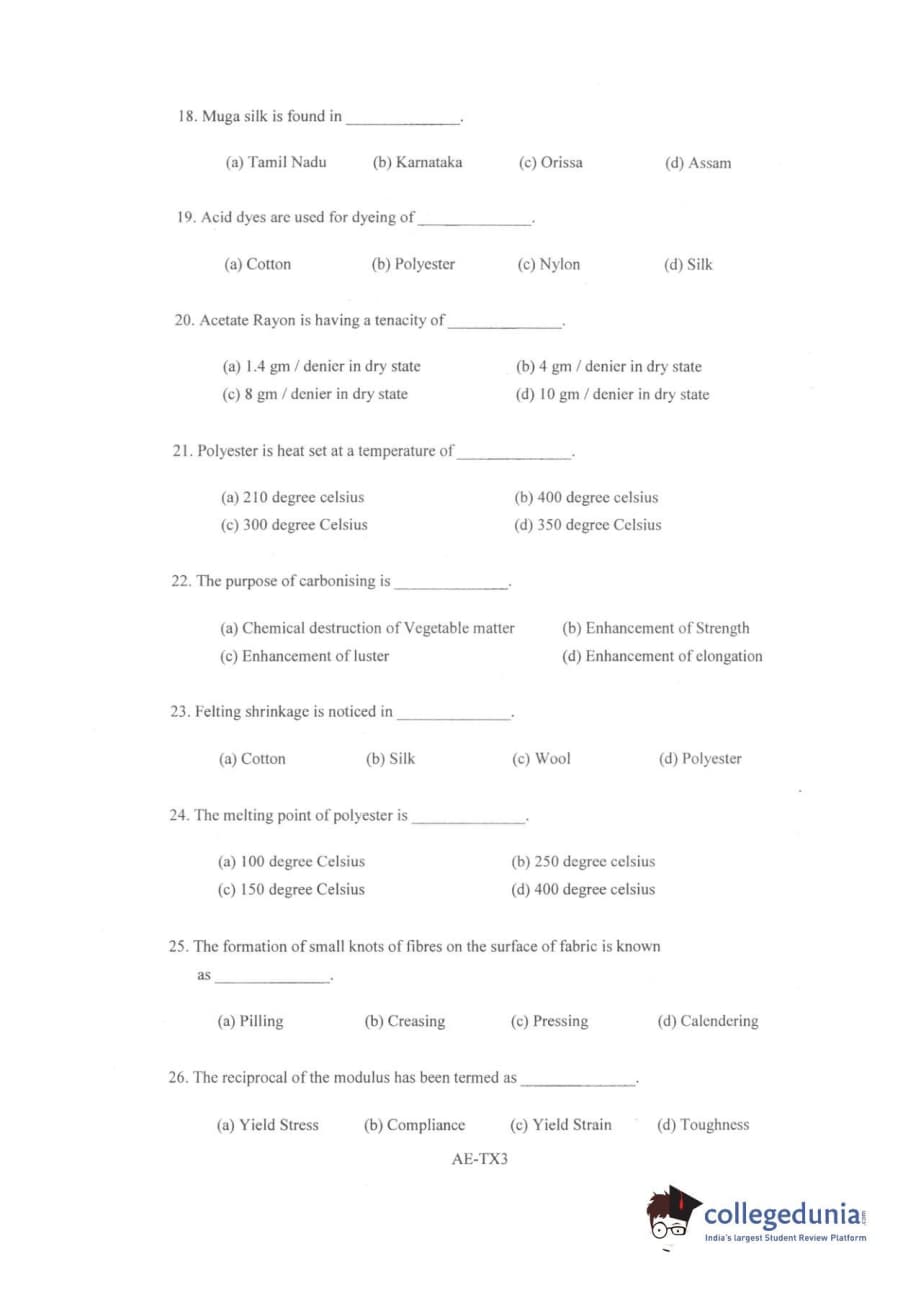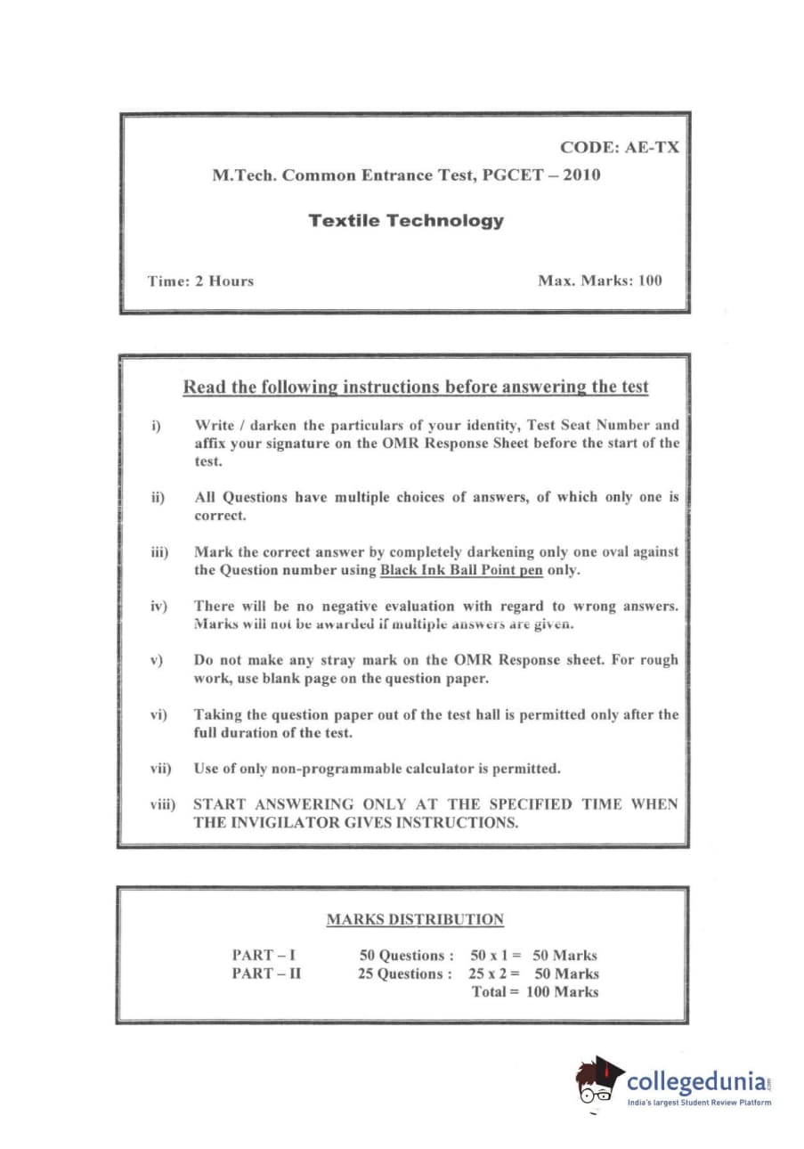 Karnataka PGCET 2010 Textile Technology Question paper with answer key pdf is available for download. The exam was successfully organized by Karnataka Examinations Authority (KEA). The question paper comprised a total of 75 questions.