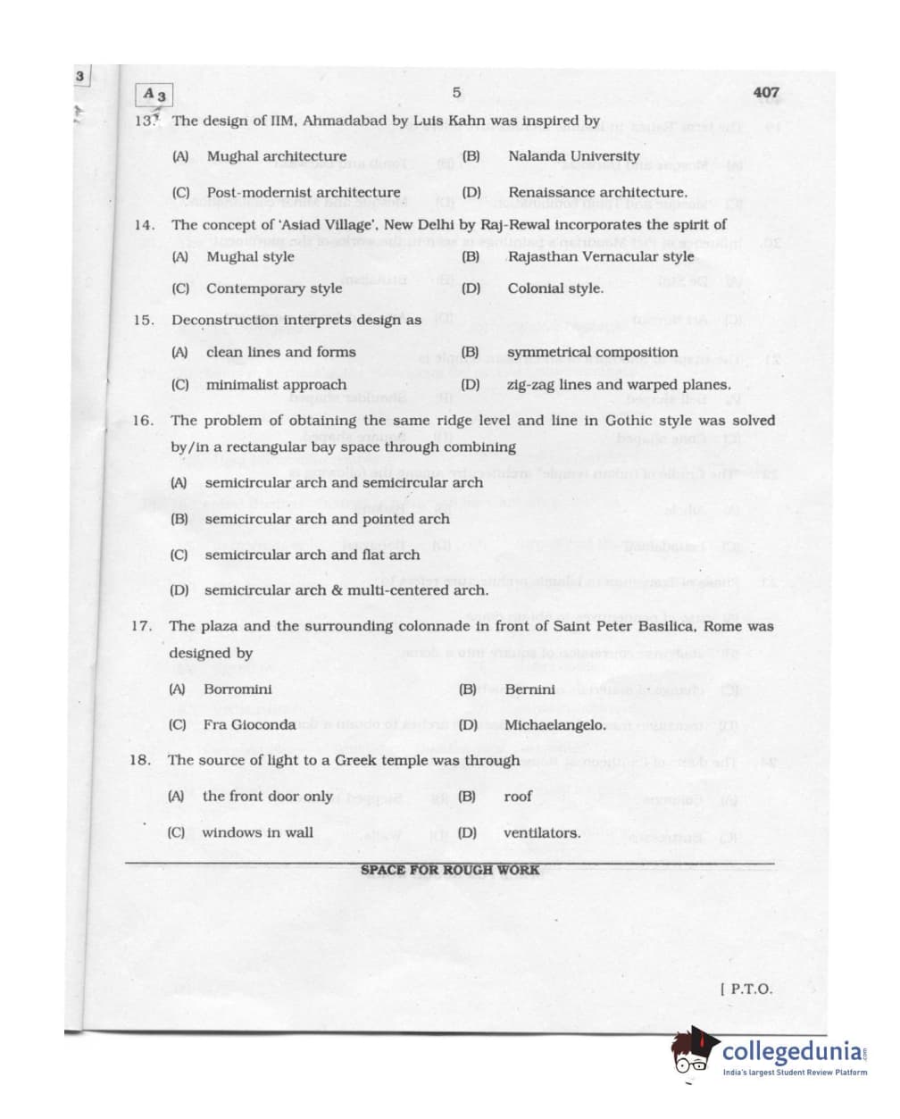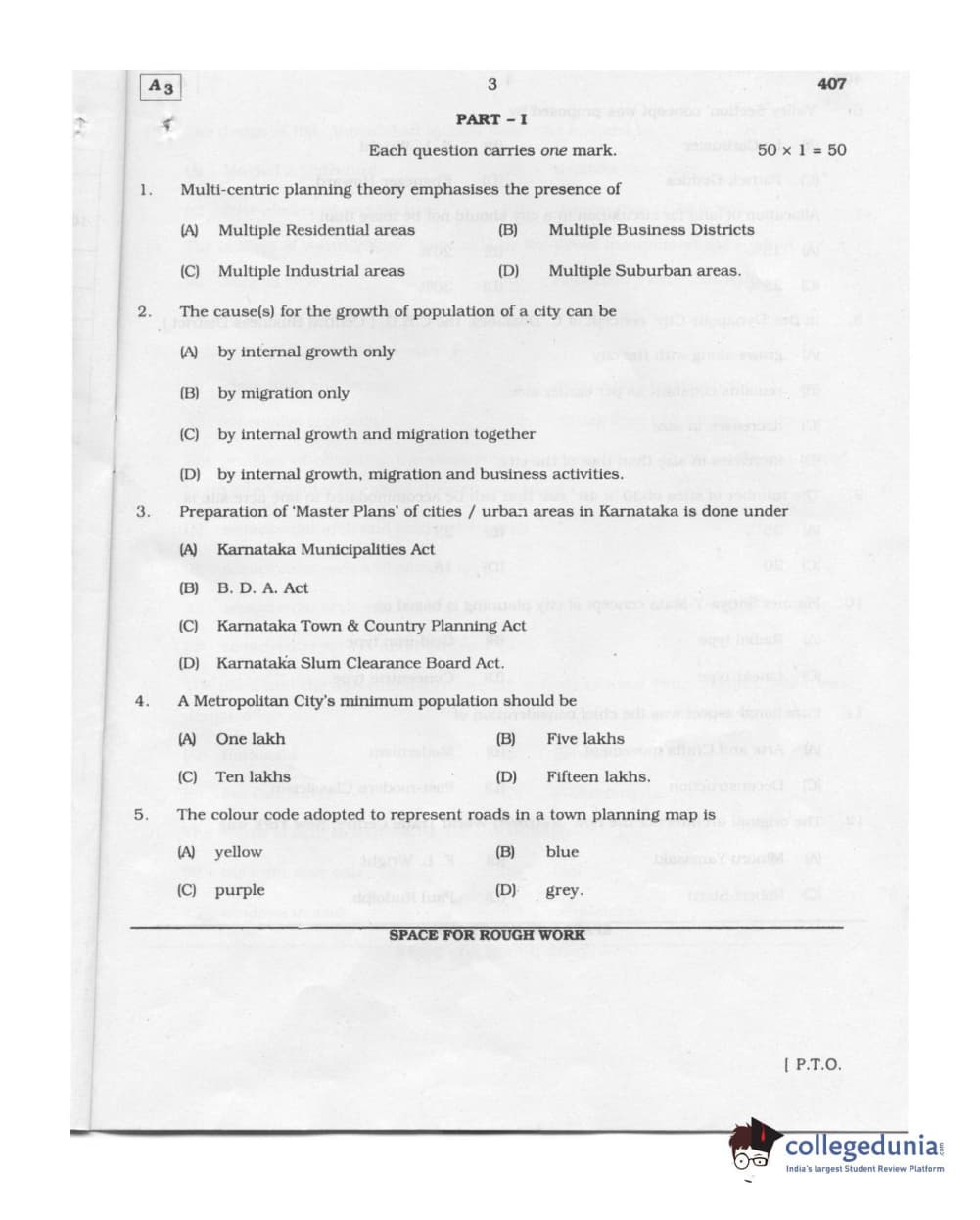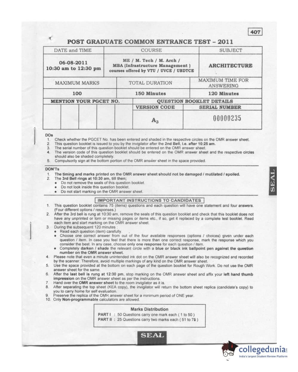 Karnataka PGCET 2011 Architecture Question paper with answer key pdf conducted on August 6, 2011 from for A-3 is available for download. The exam was successfully organized by Karnataka Examinations Authority (KEA). The question paper comprised a total of 75 questions.