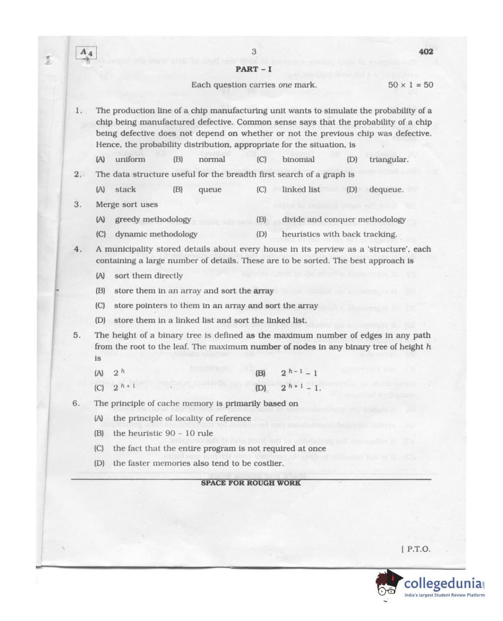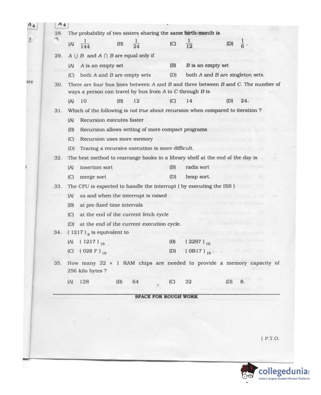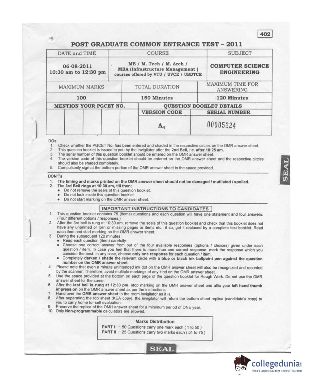 Karnataka PGCET 2011 Computer Science and Engineering Question paper with answer key pdf conducted on August 6, 2011 from for A-4 is available for download. The exam was successfully organized by Karnataka Examinations Authority (KEA). The question paper comprised a total of 75 questions.