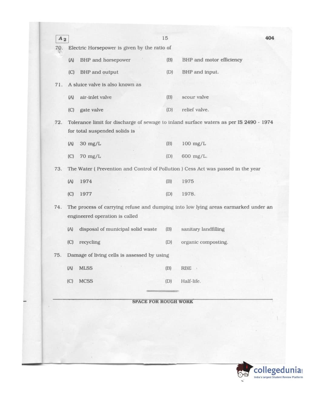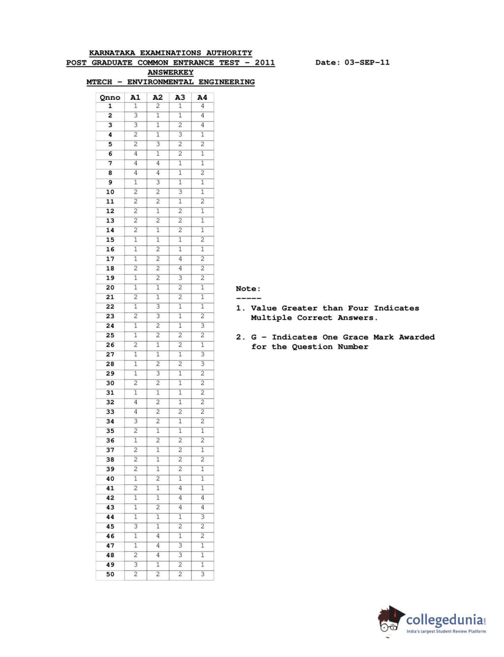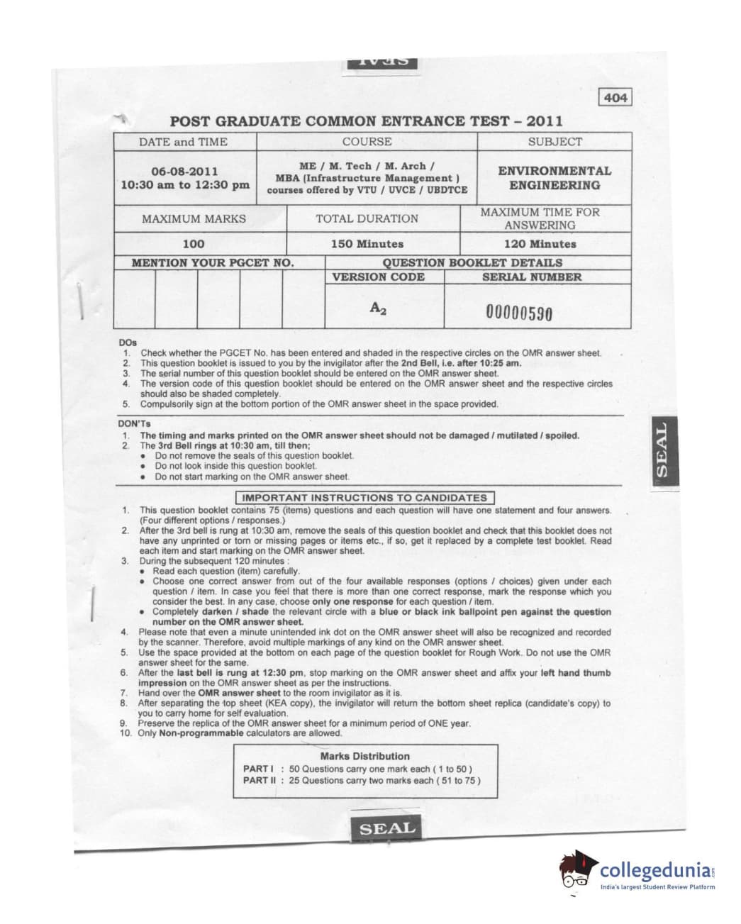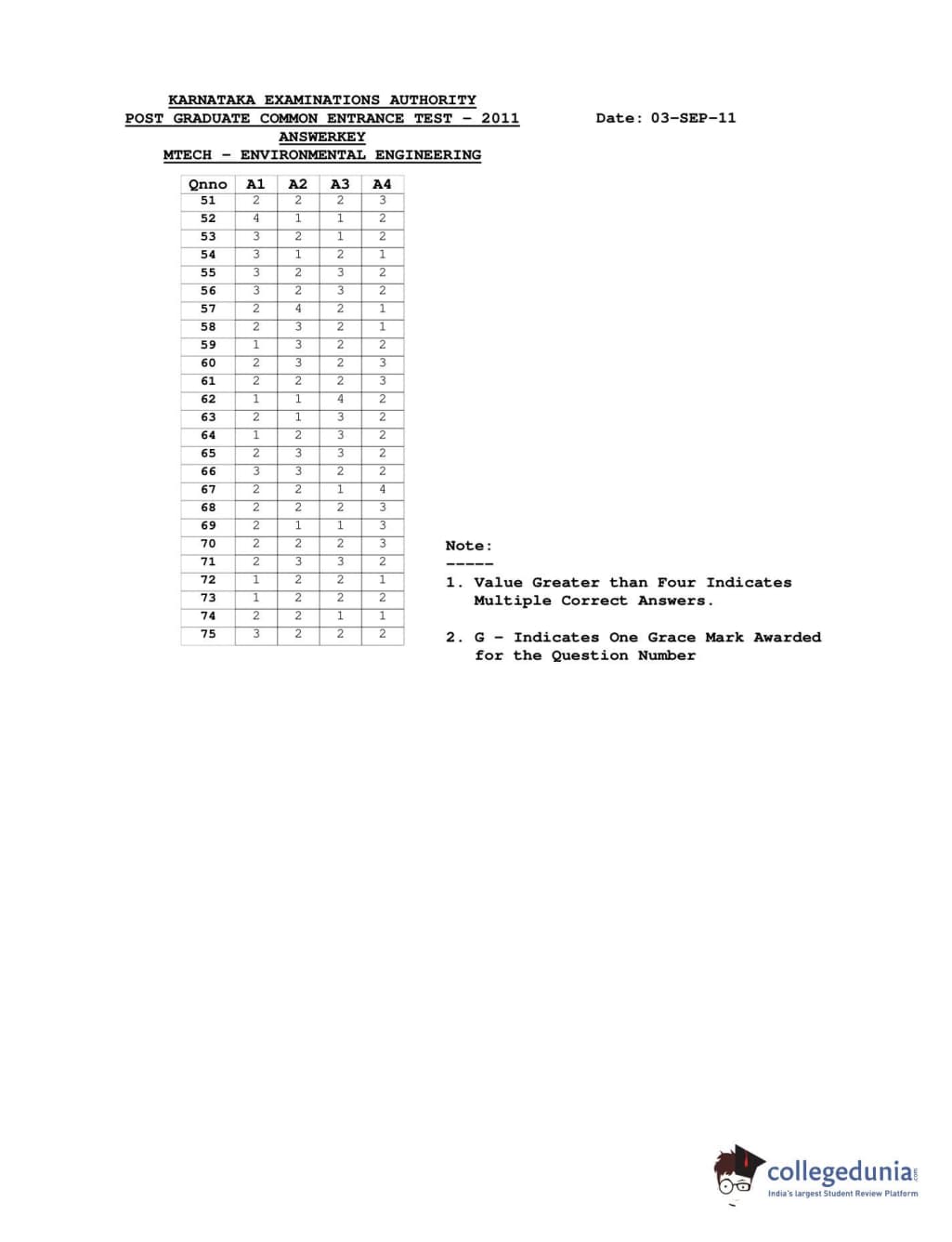 Karnataka PGCET 2011 Environmental Engineering Question paper with answer key pdf conducted on August 6, 2011 from for A-2 is available for download. The exam was successfully organized by Karnataka Examinations Authority (KEA). The question paper comprised a total of 75 questions.