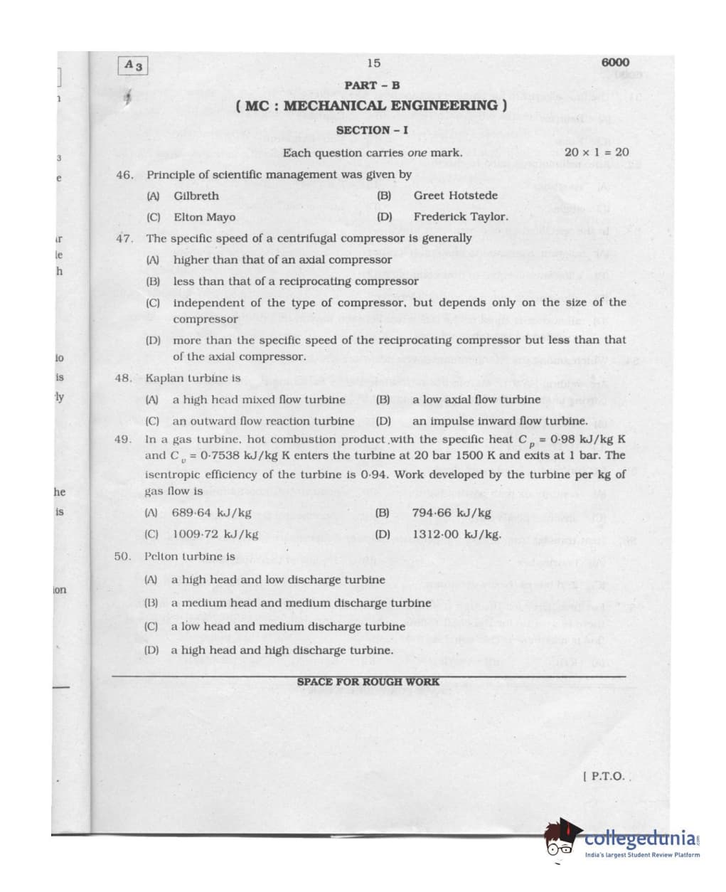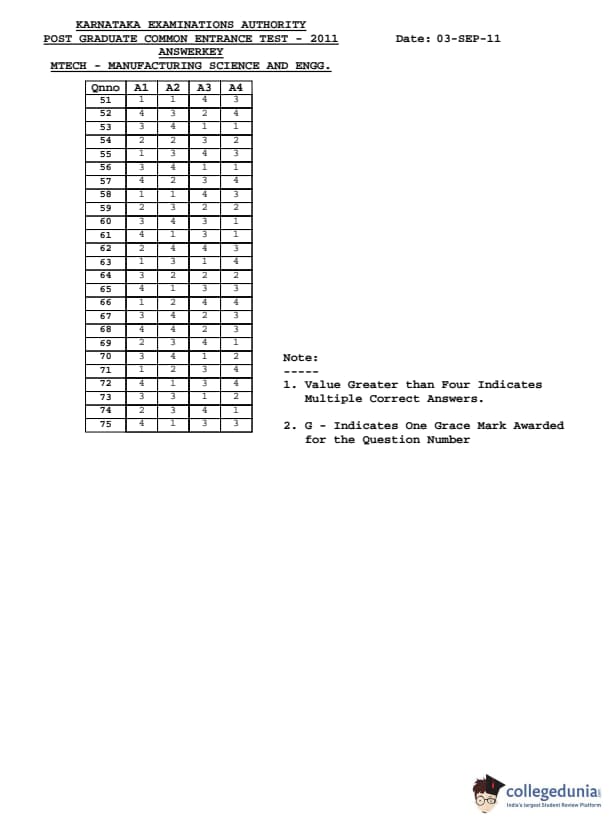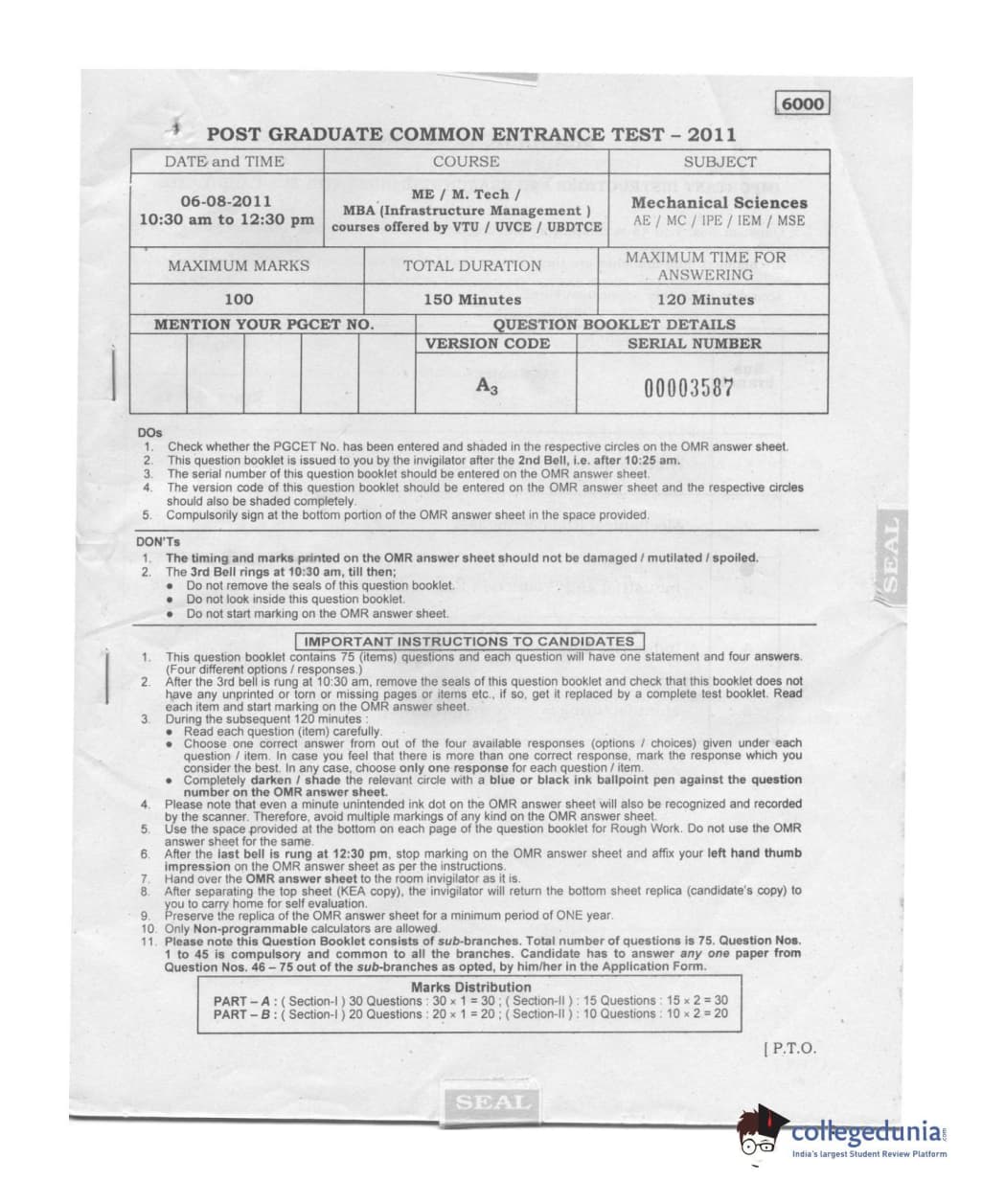 Karnataka PGCET 2011 Mechanical Sciences Question paper with answer key pdf conducted on August 6, 2011 from for A-3 is available for download. The exam was successfully organized by Karnataka Examinations Authority (KEA). The question paper comprised a total of 75 questions.