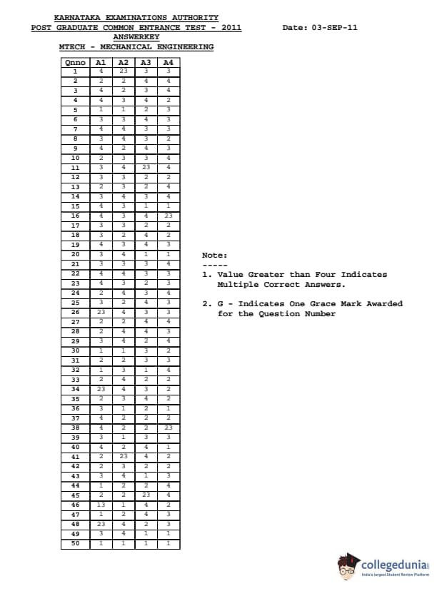 | Karnataka PGCET 2011 Mechanical Sciences Question Paper PDF | Karnataka PGCET 2011 Mechanical Sciences Answer Key PDF |