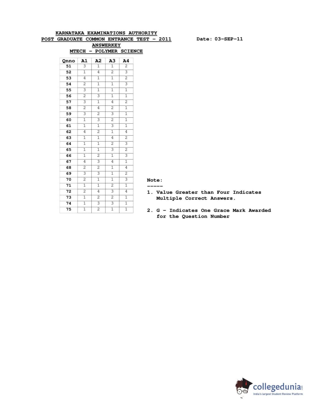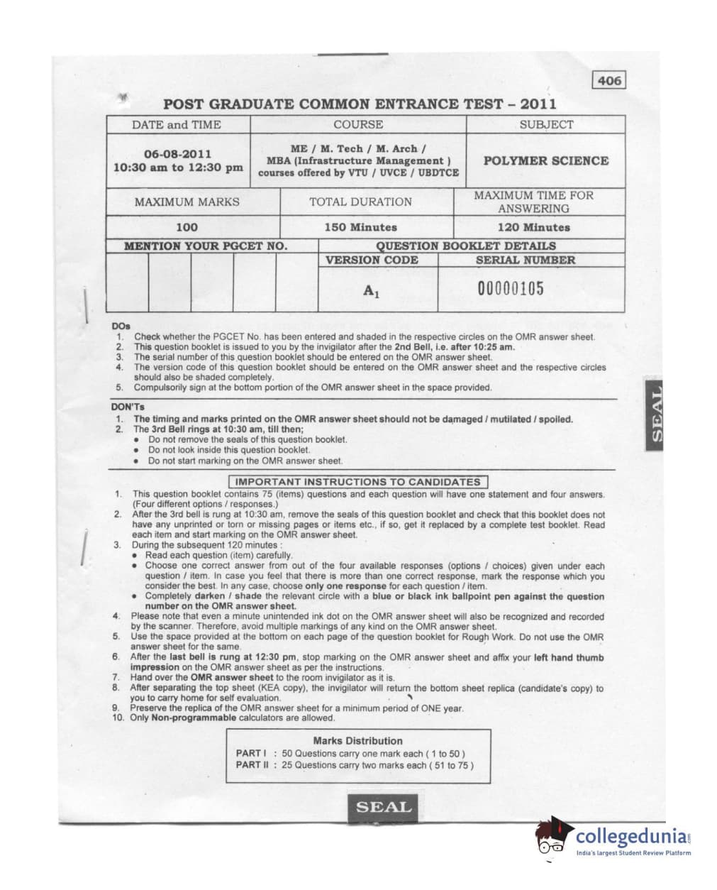 Karnataka PGCET 2011 Polymer Science and Technology Question paper with answer key pdf conducted on August 6, 2011 from for A-1 is available for download. The exam was successfully organized by Karnataka Examinations Authority (KEA). The question paper comprised a total of 75 questions.