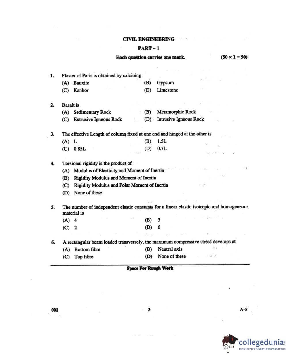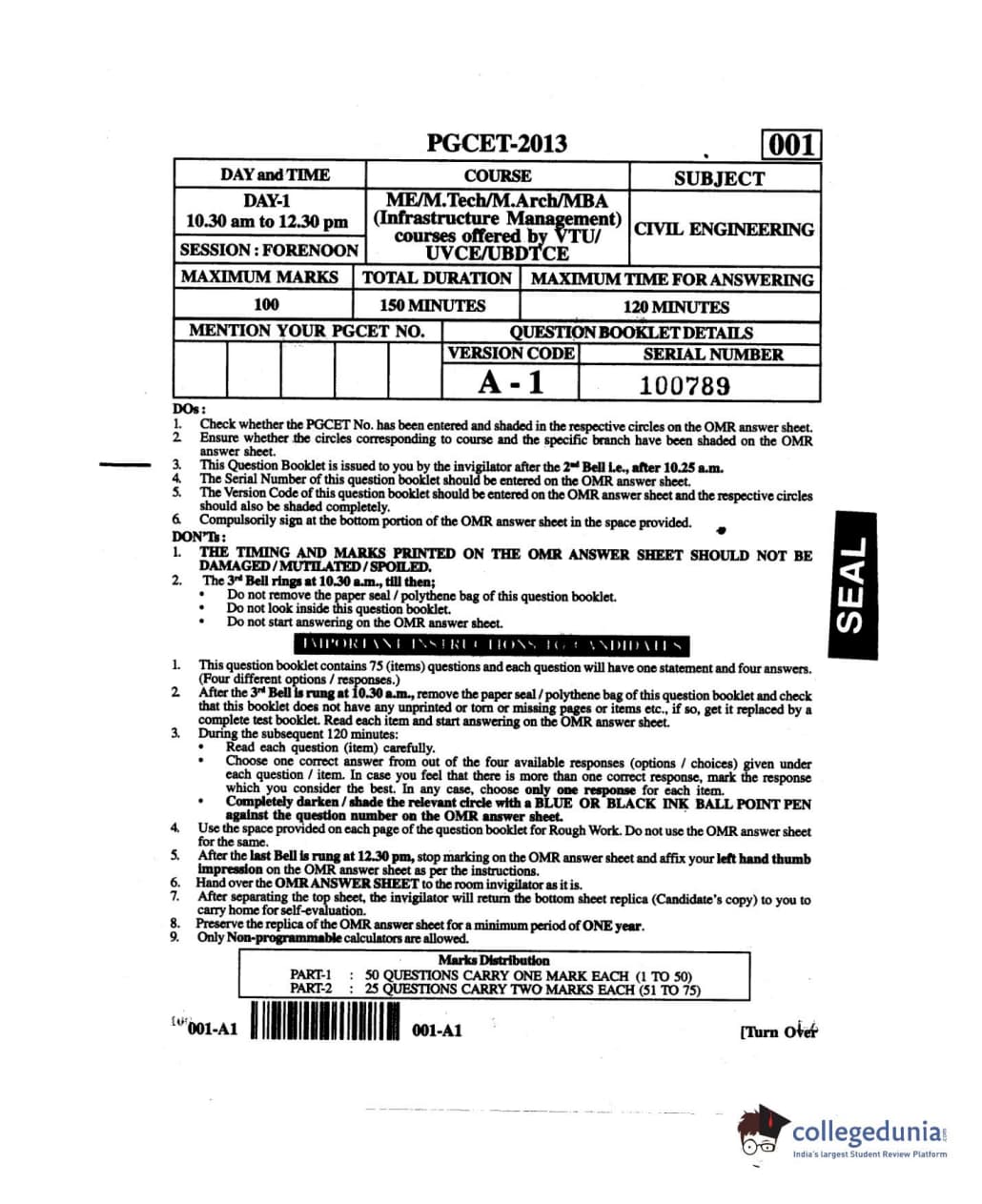 Karnataka PGCET 2013 Civil Engineering Question paper with answer key pdf conducted on July 27, 2013 for A-1 is available for download. The exam was successfully organized by Karnataka Examinations Authority (KEA). The question paper comprised a total of 75 questions.