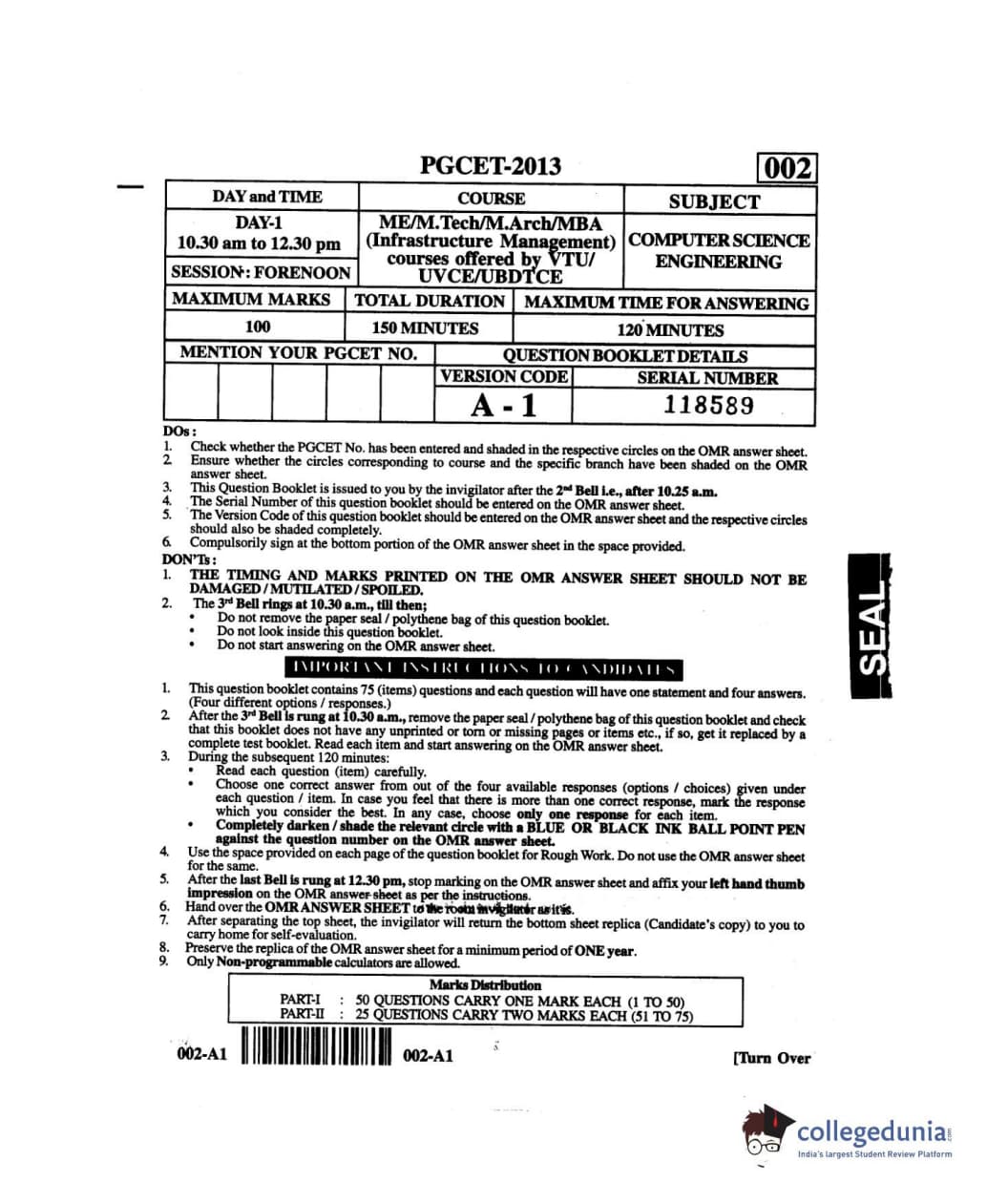 Karnataka PGCET 2013 Computer Science and Engineering Question paper with answer key pdf conducted on July 27, 2013 from for A-1 is available for download. The exam was successfully organized by Karnataka Examinations Authority (KEA). The question paper comprised a total of 75 questions.