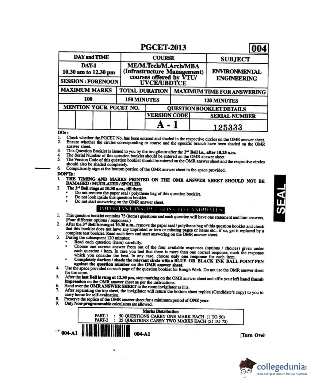 Karnataka PGCET 2013 Environmental Engineering Question paper with answer key pdf conducted on July 27, 2013 from for A-1 is available for download. The exam was successfully organized by Karnataka Examinations Authority (KEA). The question paper comprised a total of 75 questions.