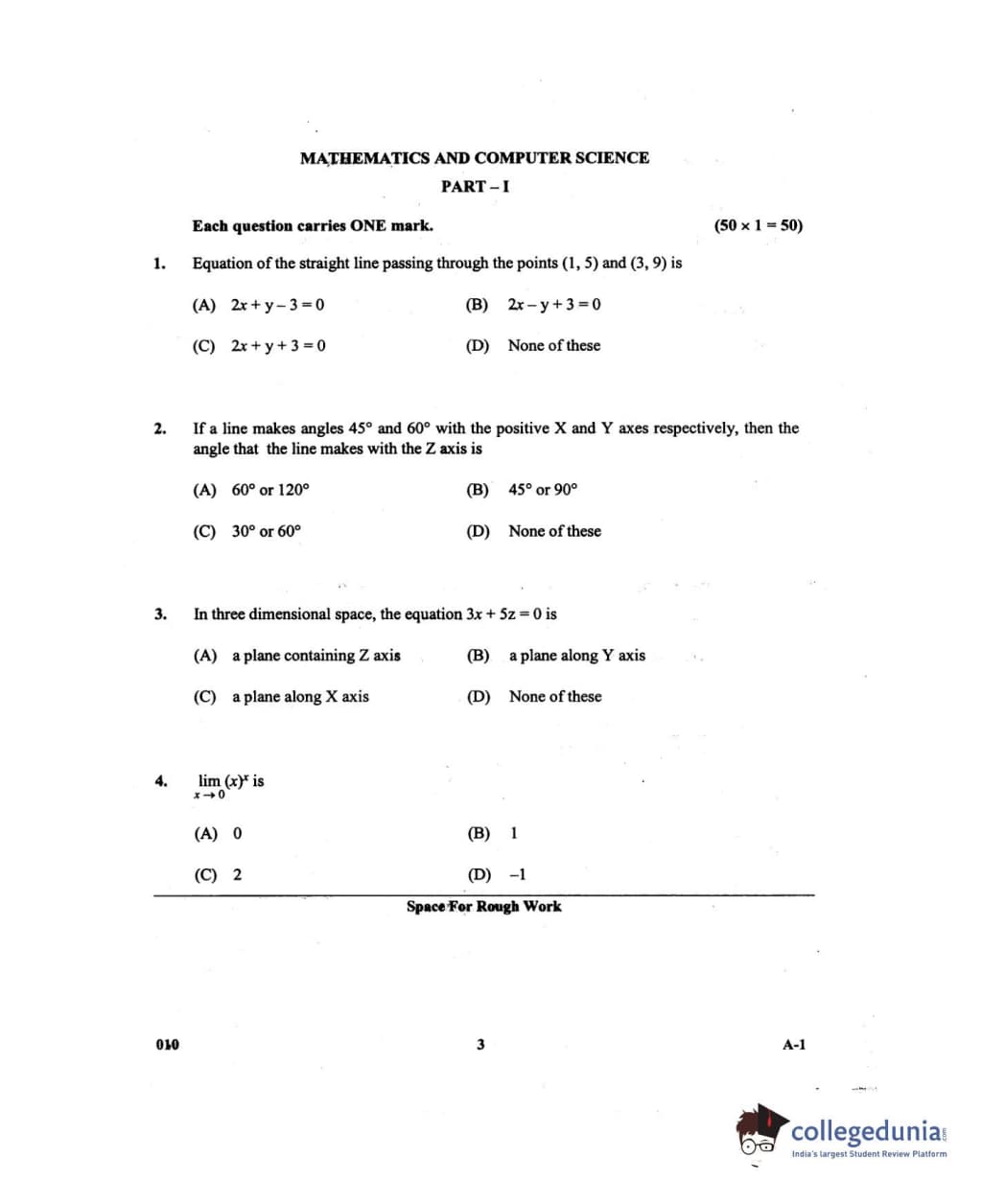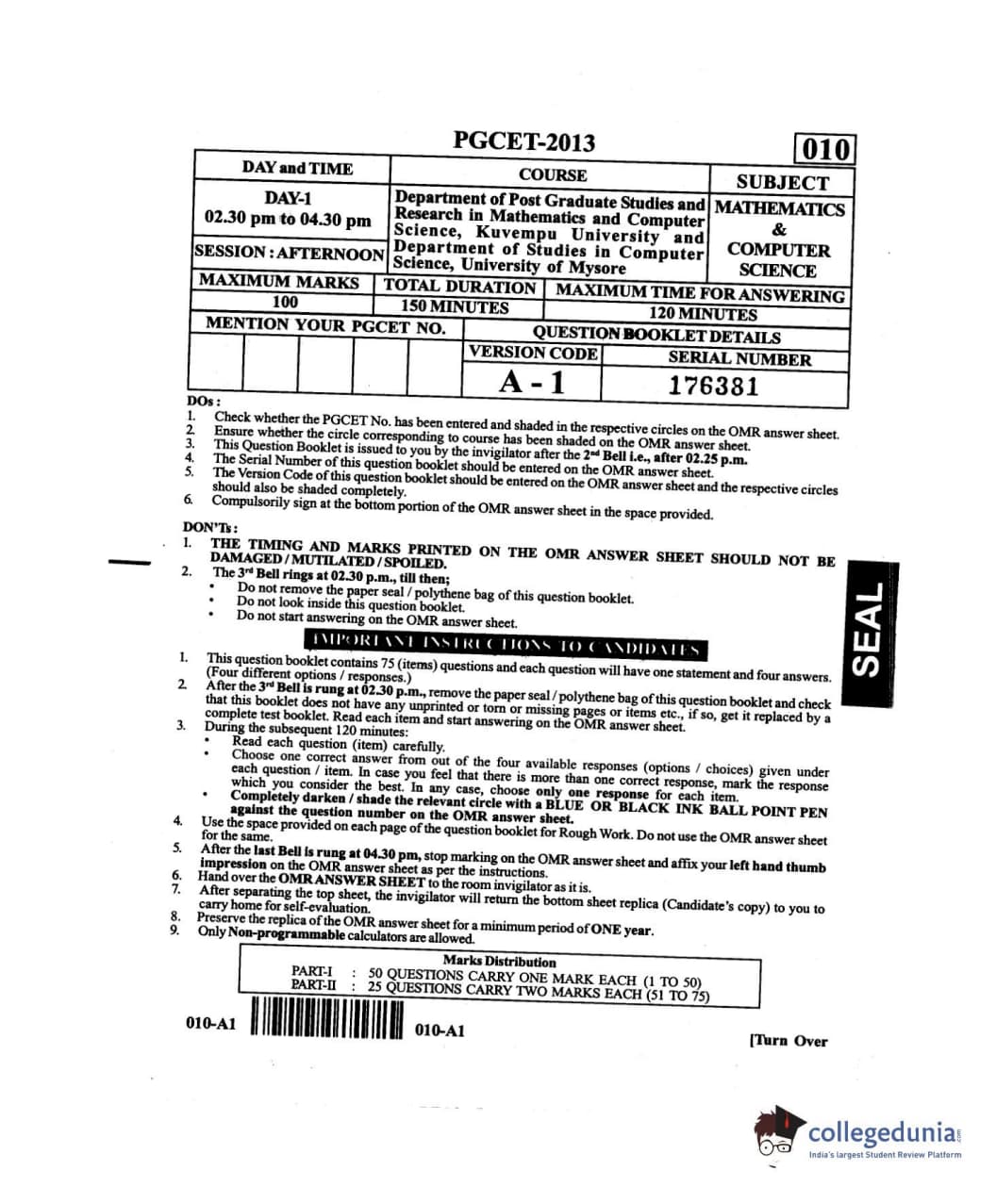 Karnataka PGCET 2013 Mathematics and Computer Science Question paper with answer key pdf conducted on July 27, 2013 in Afternoon Session 2:30 PM to 4:30 PM for A-1 is available for download. The exam was successfully organized by Karnataka Examinations Authority (KEA). The question paper comprised a total of 75 questions.