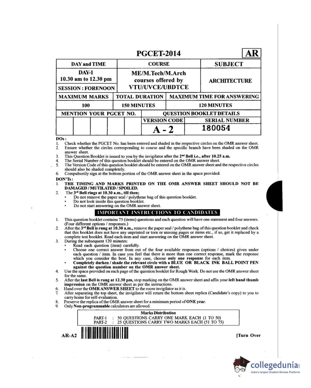Karnataka PGCET 2014 Architecture Question paper with answer key pdf for A-2 is available for download. The exam was successfully organized by Karnataka Examinations Authority (KEA). The question paper comprised a total of 75 questions.