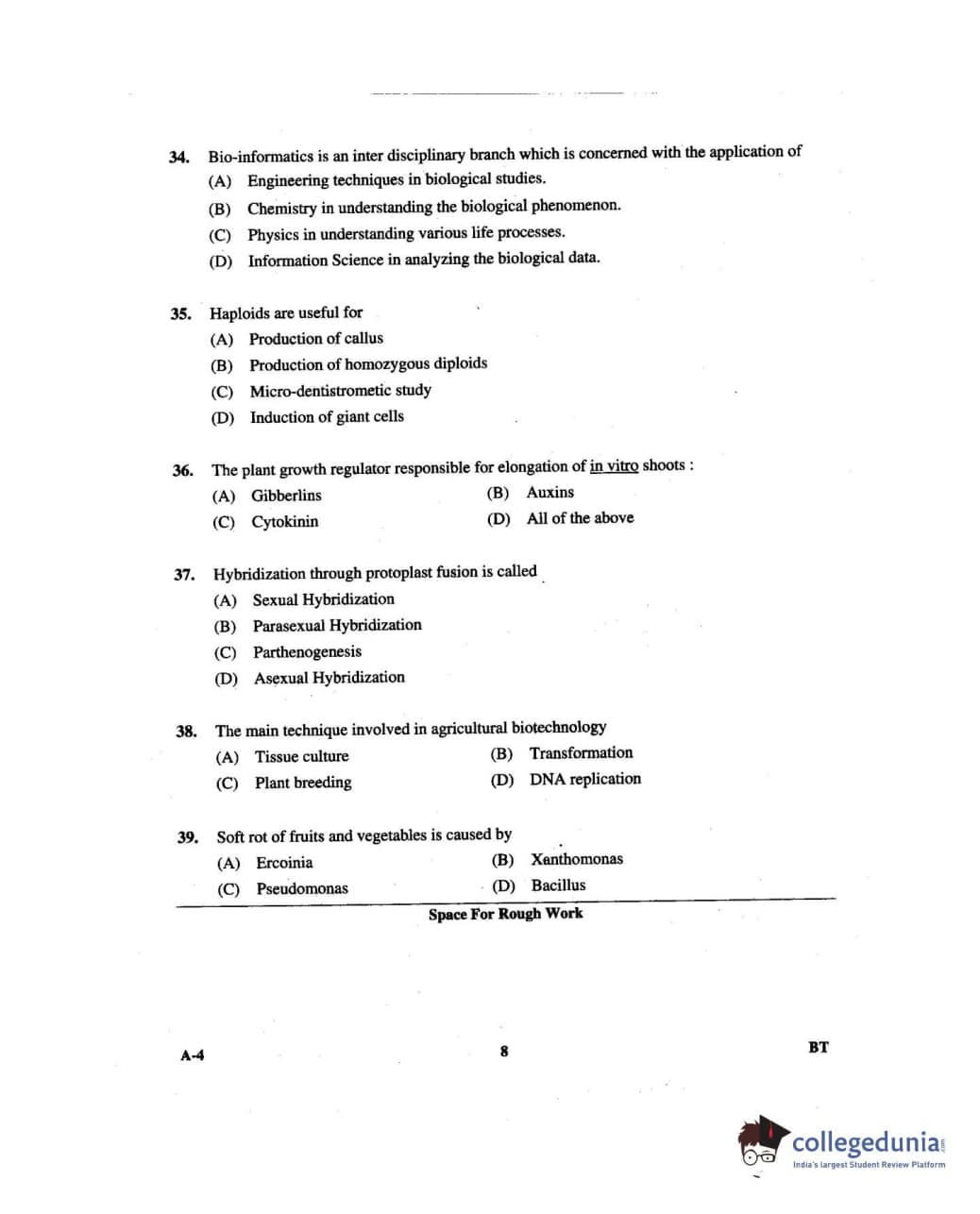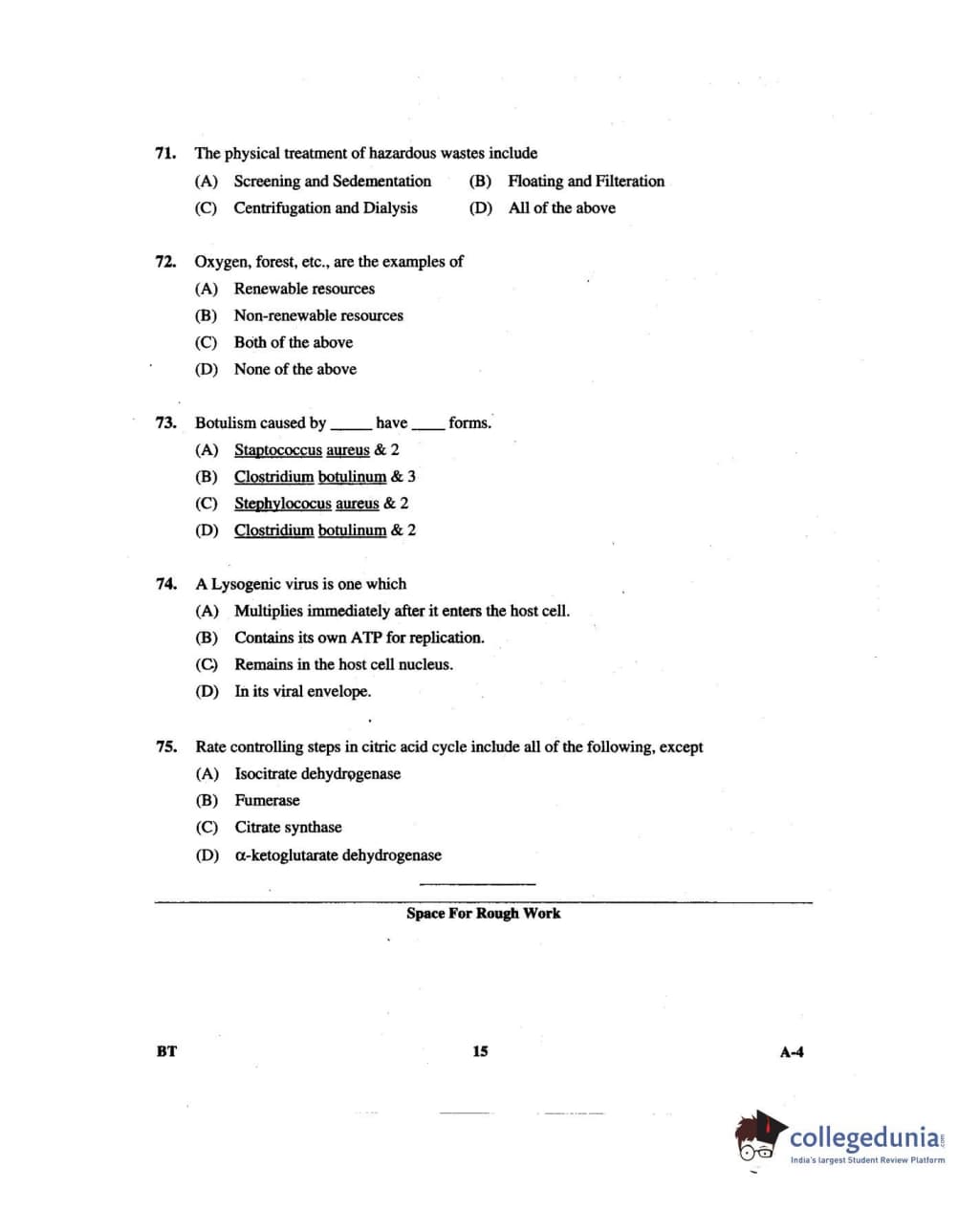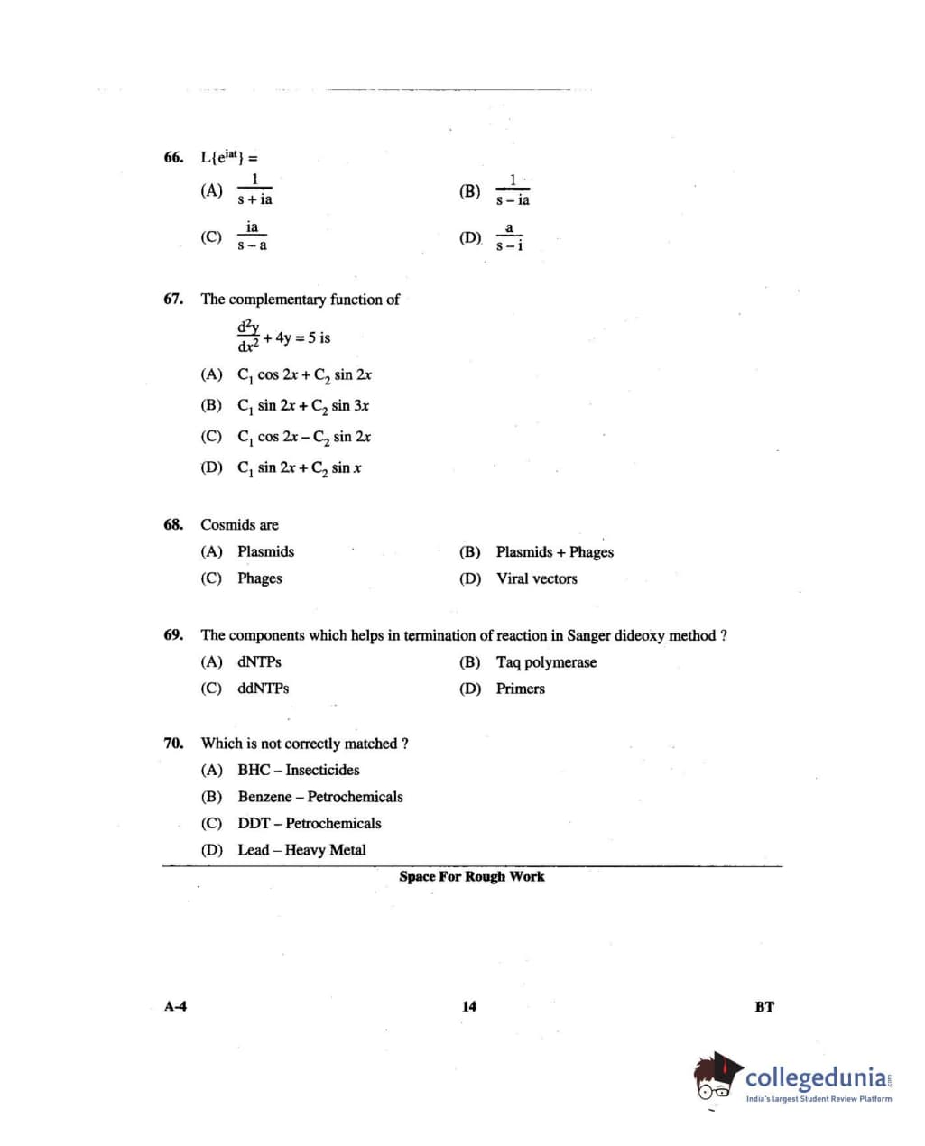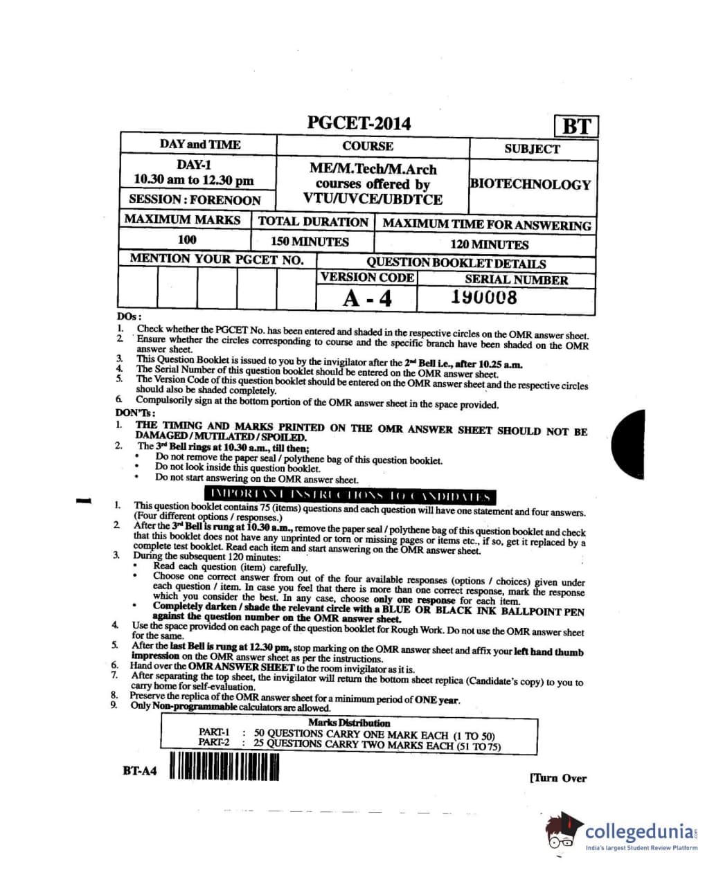 Karnataka PGCET 2014 Biotechnology Question paper with answer key pdf for A-4 is available for download. The exam was successfully organized by Karnataka Examinations Authority (KEA). The question paper comprised a total of 75 questions.