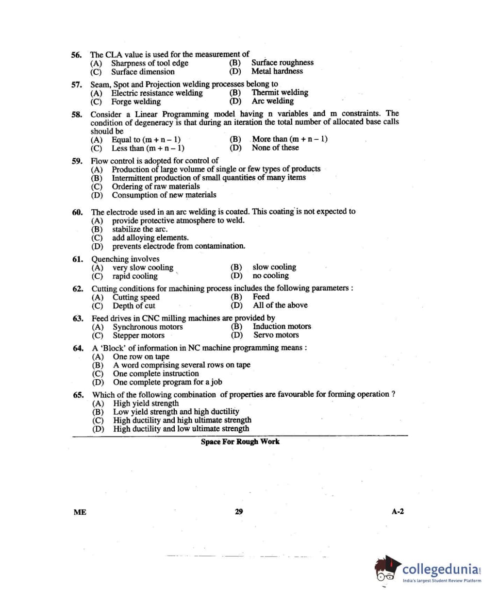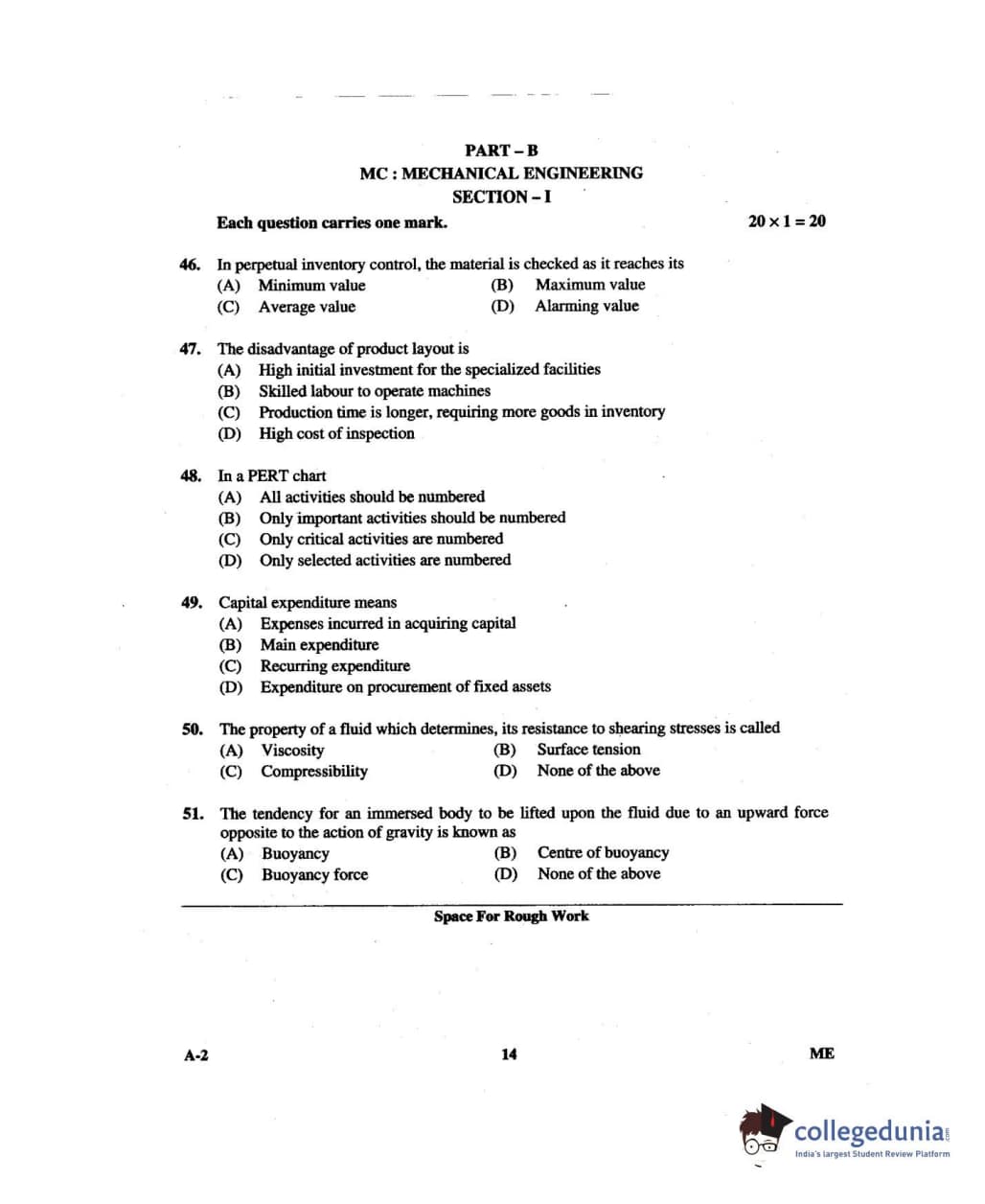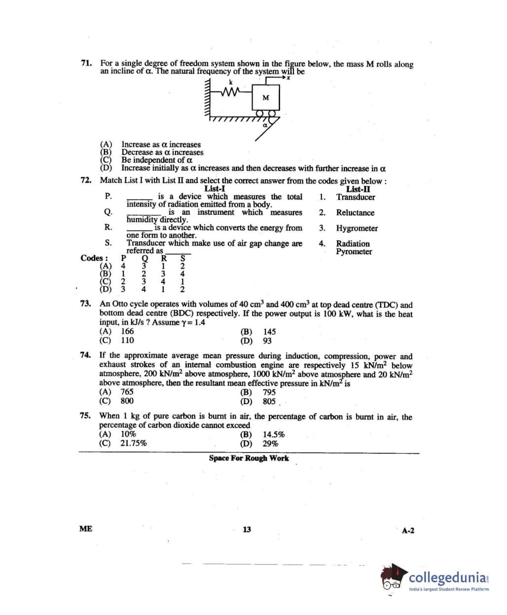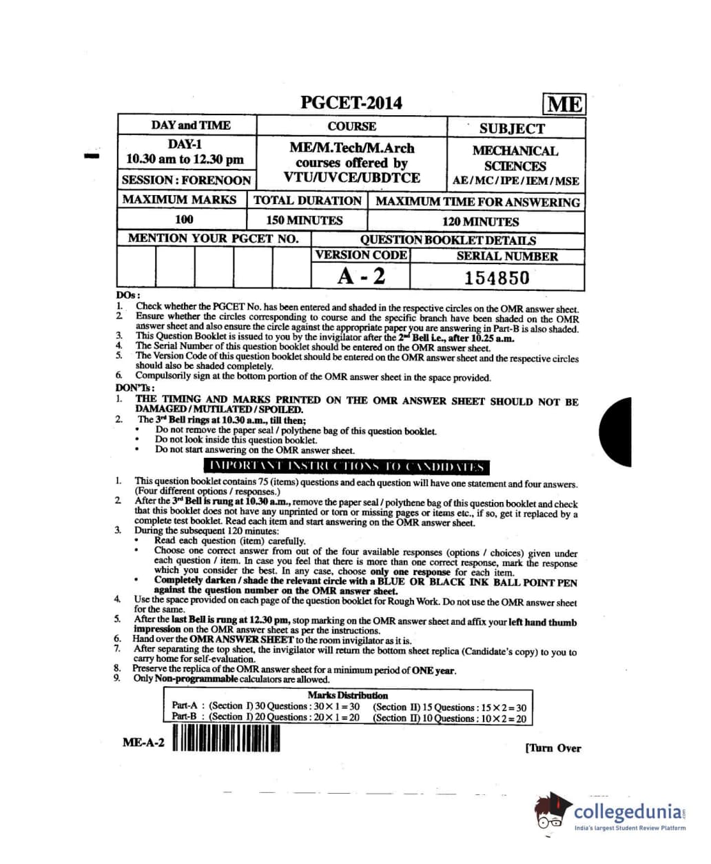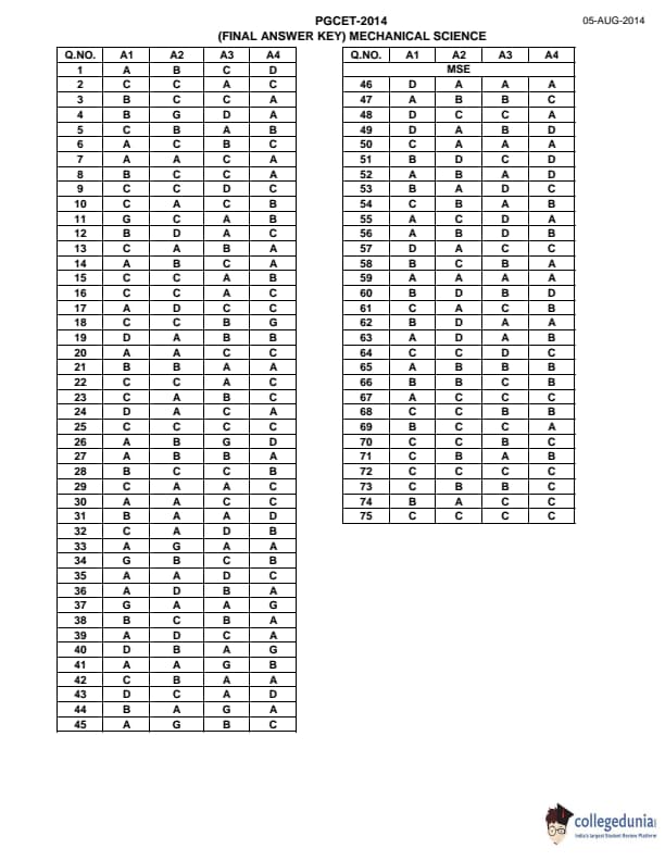 Karnataka PGCET 2014 Mechanical Science Question paper with answer key pdf for A-2 is available for download. The exam was successfully organized by Karnataka Examinations Authority (KEA). The question paper comprised a total of 75 questions.